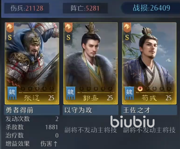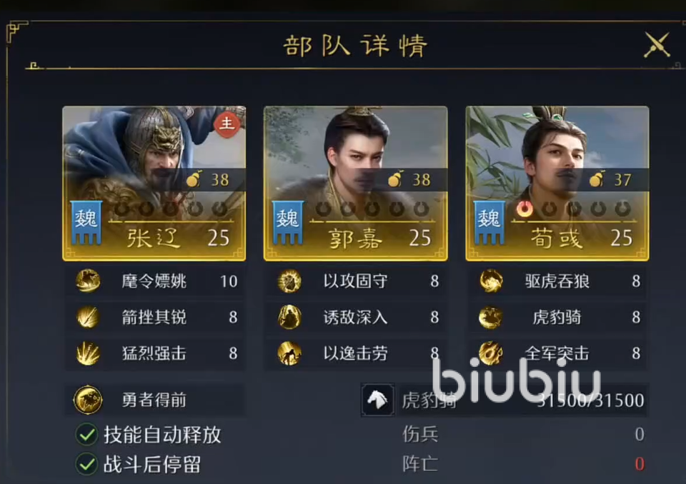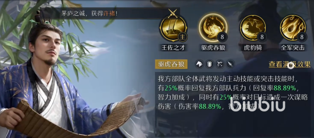 快速输出的关键闭环来自荀彧的“驱虎吞狼”技能。该技能在己方全体武将释放主动技或突击技时,有概率恢复部队兵力,并附加一次额外谋略伤害。在张辽高频提供连击支持的前提下,队友触发主动技能的次数显著增加,从而大幅提升“驱虎吞狼”的实际触发频次,形成伤害与续航双重增益的正向循环。