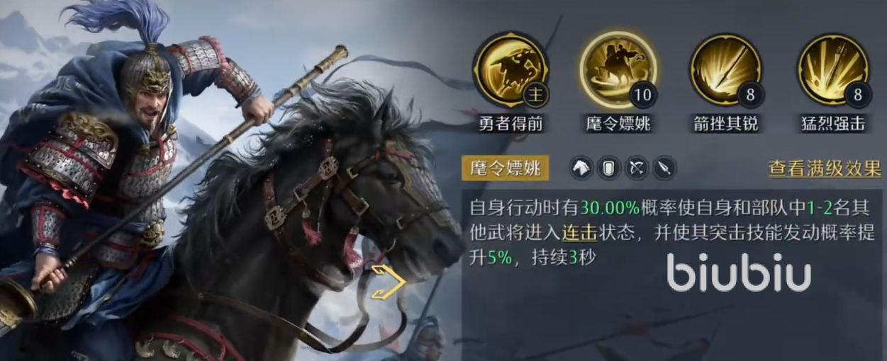 阵容的核心驱动角色是张辽。经机制调整后,其被动技能可使相邻1至2名友军获得连击状态,基础触发概率为30%;通过技能升级可提升5%,进阶后再次提升5%,最高可达35%;后续强化还可额外增加10%,最终理论上限为45%。需注意的是,该概率加成仅作用于连击触发,并不覆盖突击类技能的发动判定。