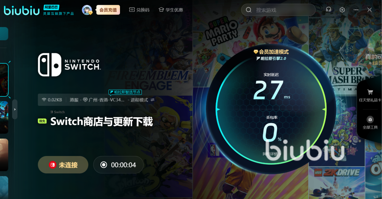 针对国服用户实际使用场景,biubiu加速器已全面适配Nintendo eShop与《马里奥赛车世界》本体运行需求。新用户注册后可立即获得24小时免费会员权限;另设通用兑换码【biubiu不卡顿】,每位账号限用一次,成功兑换后可额外获取72小时高级加速服务。双重福利叠加,确保玩家拥有充足时间实测连接稳定性、延迟表现及加速响应效率。