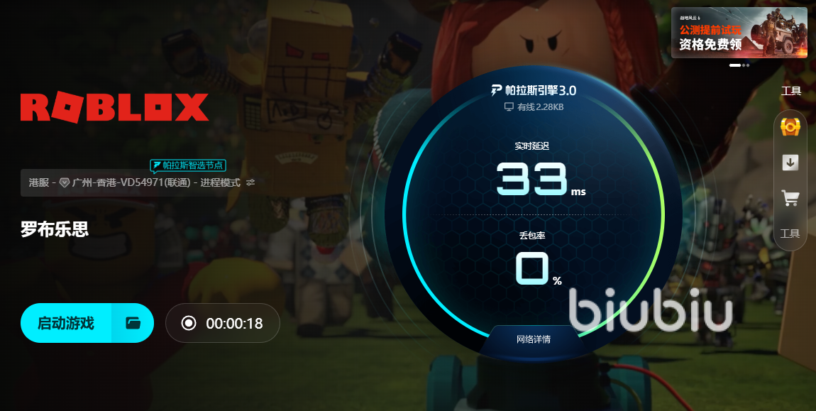 当前,biubiu加速器已完成重大版本迭代,联合职业选手Aixleft完成深度协同调优。新版本搭载帕拉斯引擎3.0,集成动态带宽分配、毫秒级节点探测与多协议智能识别技术,可自动识别Roblox客户端通信特征,并为其匹配最优传输通道。实测数据显示,该方案可显著压缩端到端延迟,有效抑制数据丢包,在MOBA类对抗、FPS高帧率场景以及沙盒世界大规模实体同步中均表现稳定。