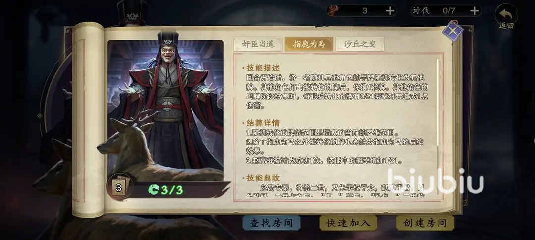 二技能【指鹿为马】为控场型效果:回合开始时,赵高随机选取一名角色,将其一张手牌转化为另一类牌(如将【闪】转为【桃】)。若该转化牌被打出,赵高立即摸一张牌。应对策略有二:其一,在出牌阶段主动弃掉高风险转化牌,切断摸牌链;其二,优先选用具备稳定弃牌或反制能力的武将,例如张良(可限制关键牌使用)、小乔(通过【天香】转移伤害并规避转化影响)、吕布(高爆发压缩回合数,减少技能触发频次)。