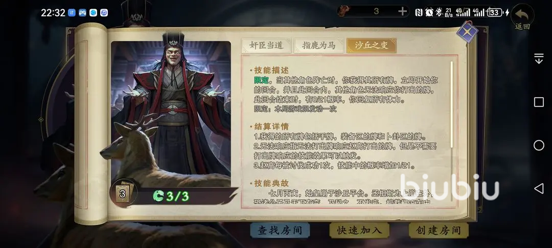 三技能【沙丘之变】为高危连锁技:当任意角色阵亡时,赵高立即获得该角色所有手牌与装备牌,并在本回合内免疫所有响应类操作——即其他角色无法对其使用【闪】、【无懈可击】等反制牌。因此,团队生存是通关前提。务必避免减员,可通过张辽(【突袭】抢牌补给)、张飞(【咆哮】稳定输出降低回合压力)、陆逊(【连营】持续过牌维持续航)等具备强生存或续航能力的武将构建阵容。