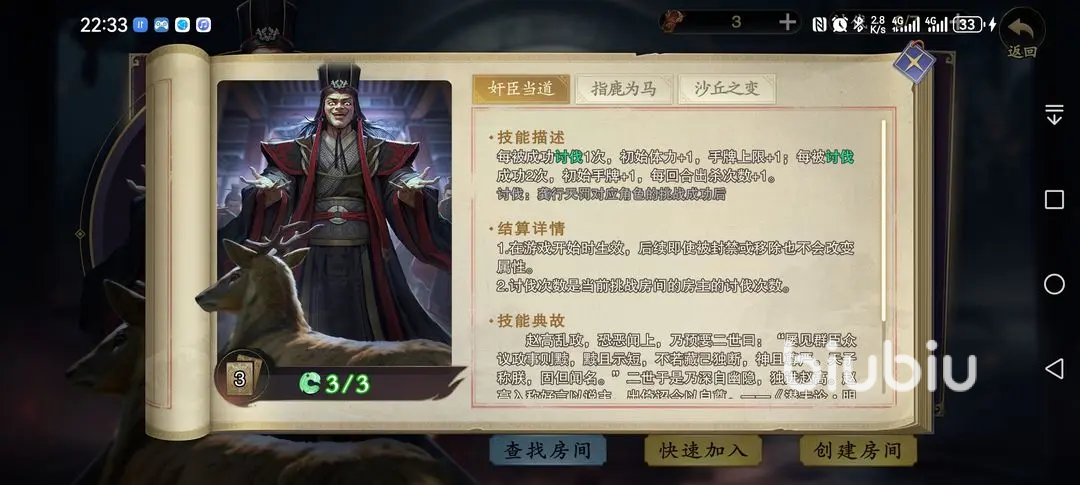赵高作为首期上线的天罚Boss,拥有三重核心技能,机制环环相扣。其一技能【奸臣当道】具备成长性:每被成功逃逸1次,赵高初始体力与手牌上限各+1;每被讨伐成功2次,其初始手牌数+1,且每回合可使用的【杀】次数+1。这意味着重复挑战虽可积累资源,但Boss强度亦同步提升,不可忽视成长累积效应。