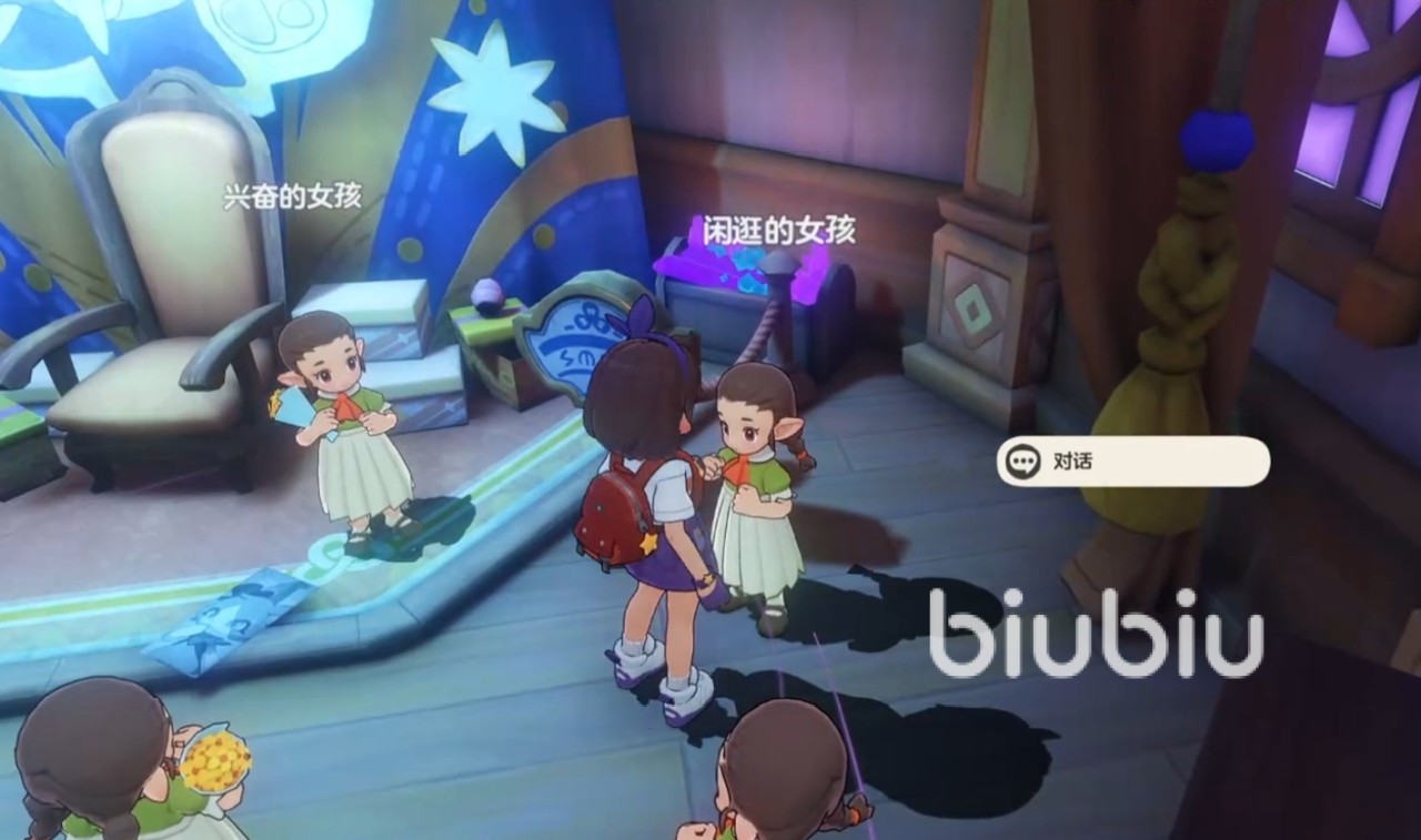 进入秘境首层,可见四名手持鲜花的小女孩。其中仅有一人未持花,与其对话后触发幻象解除机制,随即遭遇野生精灵并进入战斗。击败或收服该精灵后,将掉落小夜精灵蛋。在该区域地面及周边搜索,可拾取高级咕噜球与魔法石;另有一颗蓝色眠星悬浮于高背椅正上方,需注意抬头查看。