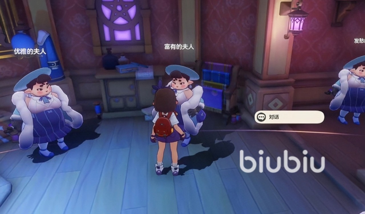 前行至第二区域,场景切换为数位身着礼服的夫人。此处需识别伪装者——关键线索在于服饰细节。角落处散落2枚魔法石;黄棕色矮柜可推动,首次推动后可在柜内获得3枚游戏币。继续深入,再次推动同款矮柜,其后方隐藏通道内角落放置1枚普通咕噜球。随后与“热爱艺术的夫人”交谈,她会提示差异点:伪装者衣饰上缺少蝴蝶纹样。确认目标后触发战斗,对手为小夜的完全体形态——朔夜伊芙。需特别注意:若未能首回合击败,朔夜伊芙将使用“隐藏条款”技能,随机交换我方与自身已习得技能,大幅提升战斗难度。胜利后开启超级华丽宝箱。