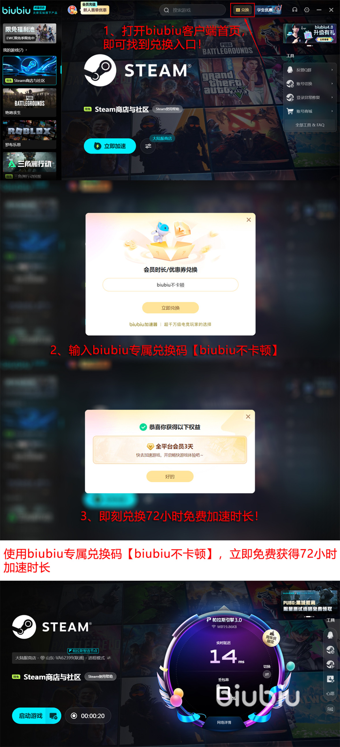 为便于用户体验效果,新注册biubiu账号即可获赠24小时全功能加速时长;另提供通用兑换码【biubiu不卡顿】,可额外激活3天连续加速服务,总计达96小时。该兑换码支持所有账号类型,包括已有账户,且每个账号限用一次,无设备绑定限制。