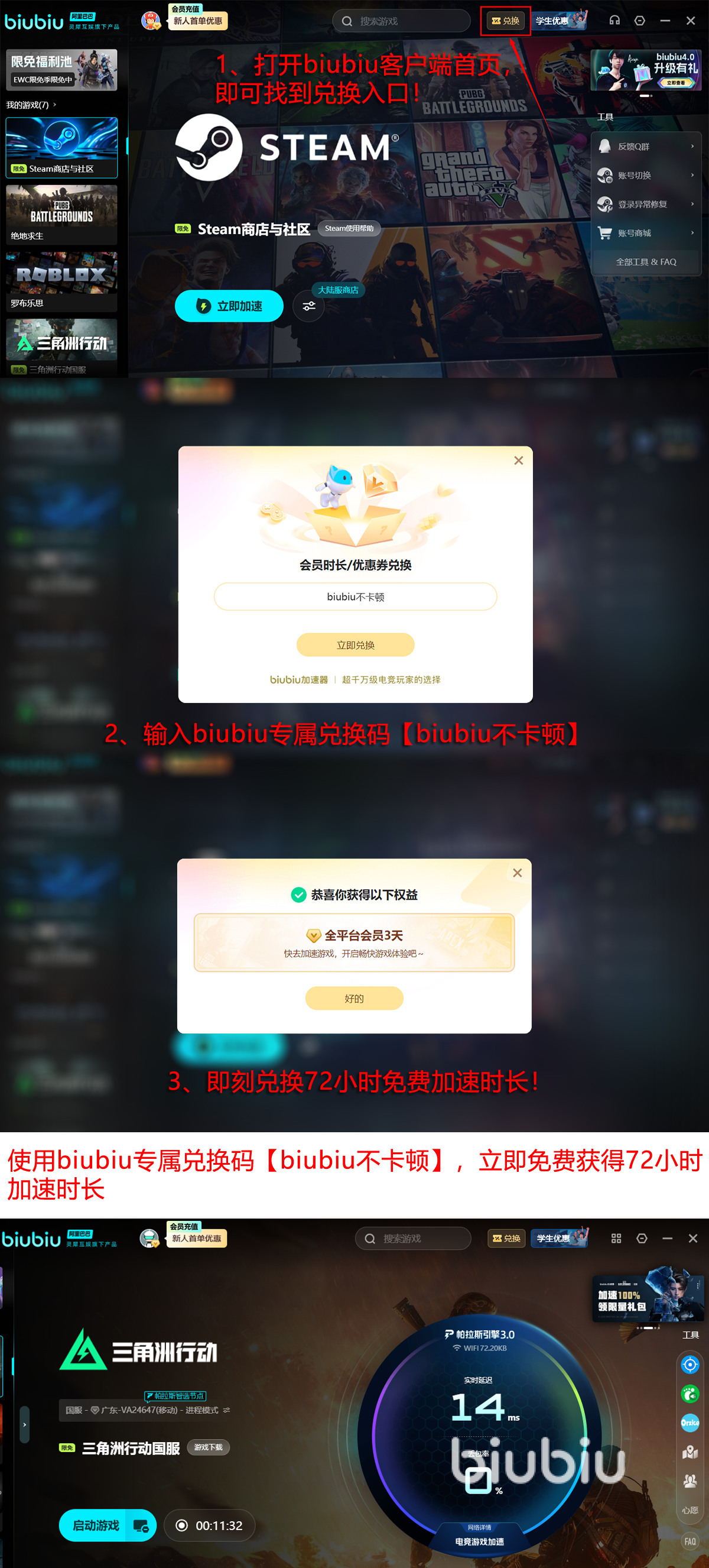 尚未体验过低延迟实战效果的玩家,可通过新用户注册即享24小时免费加速服务,充分测试优化效果。所有用户(含老用户)还可凭兑换码【biubiu不卡顿】额外领取连续3天加速权益。首次使用即可叠加获得总计96小时免费加速时长,全面覆盖多场高强度撤离作战需求。