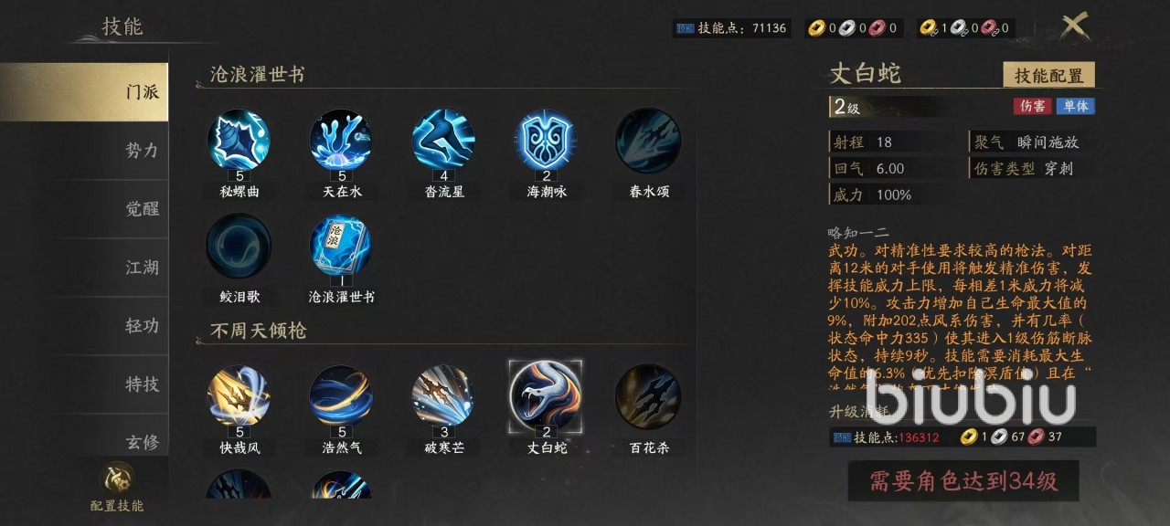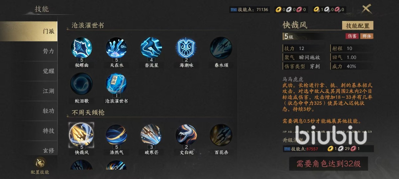 首推核心位移技“沓流星”,具备多段方向性突进效果,可在极短时间内完成多次位置切换,并同步清除自身所受定身、缓速等负面状态。该技能既是起手压制的关键,也是反制控制链、衔接后续输出的重要枢纽。第二为远程物理输出技“丈白蛇”,伤害数值随目标距离动态变化,命中时附带破甲与生命值转化攻击力效果,对操作者预判距离的能力提出较高要求。第三是心法类技能“浩然气”,属纯物理增益型心法,依据角色力属性成长提升基础物理攻击强度。第四为近身复合技“百花杀”,兼具高额贴身伤害与短时控制效果,适用于打断或限制敌方关键动作。第五为功能性普攻强化技“快哉风”,基础物理伤害附带迟钝效果,是构建持续压制节奏的重要手段之一。