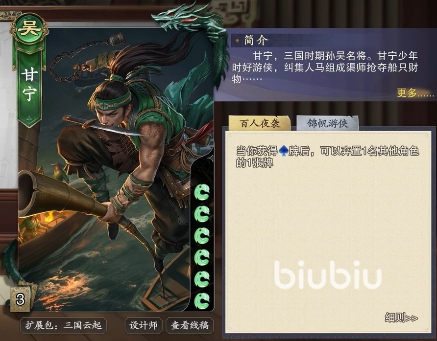 甘宁的“锦帆”技能使其在拥有黑桃花色牌时可强制弃置一名角色一张手牌;更关键的是,其出牌阶段可主动将全部手牌转为黑桃并弃置,随后摸取等量牌。这一机制天然适配大乔的“君生别离”——当大乔选择甘宁作为登场武将时,每当甘宁弃置手牌(含主动弃置),即可额外指定一名角色弃置一张手牌。两者形成闭环:甘宁每回合必弃牌→大乔必触发→双人同步拆牌。该组合不依赖额外条件,发动频率高,属于低门槛高回报的拆迁典范。