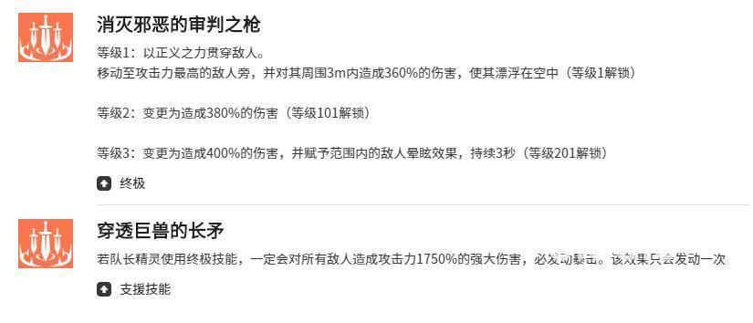 作为终极技,【消灭邪恶的审判之枪】拥有全角色最强单点穿透与群体控场双重效果:以正义能量凝聚长枪贯穿目标,同时对半径3米内所有敌人施加浮空状态(持续时间依技能等级而定),使其无法行动并暴露于集火范围。而支援型技能【穿透巨兽的长矛】则是一次性全局爆发技,释放后对全场敌方单位造成巨额固定伤害,该技能整场战斗仅可触发一次,需配合战术节奏精准释放。