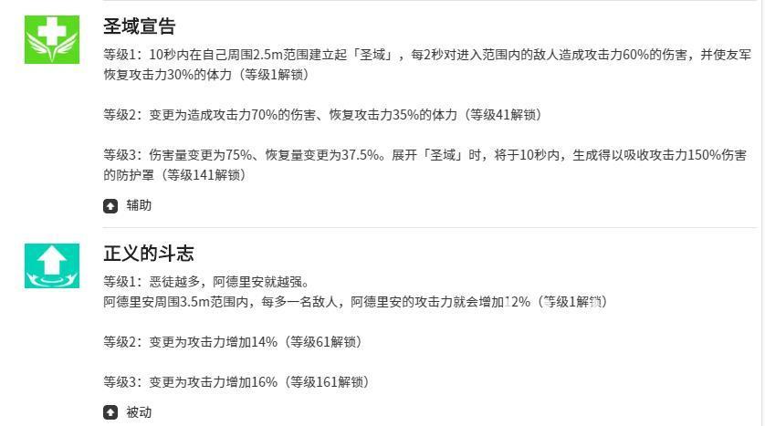【圣域宣告】属于范围压制型技能,可在自身2.5米圆形区域内展开神圣结界,对进入区域的敌人立即造成60%伤害;技能升级后伤害上限依次提升至70%与75%,形成稳定AOE压制区。此外,被动天赋【正义的斗志】赋予阿德里安独特的环境适应性——其周围每存在1名敌方单位,自身全属性攻击力即提升12%,敌方密度越高,输出增幅越显著,大幅强化团战持续作战能力。