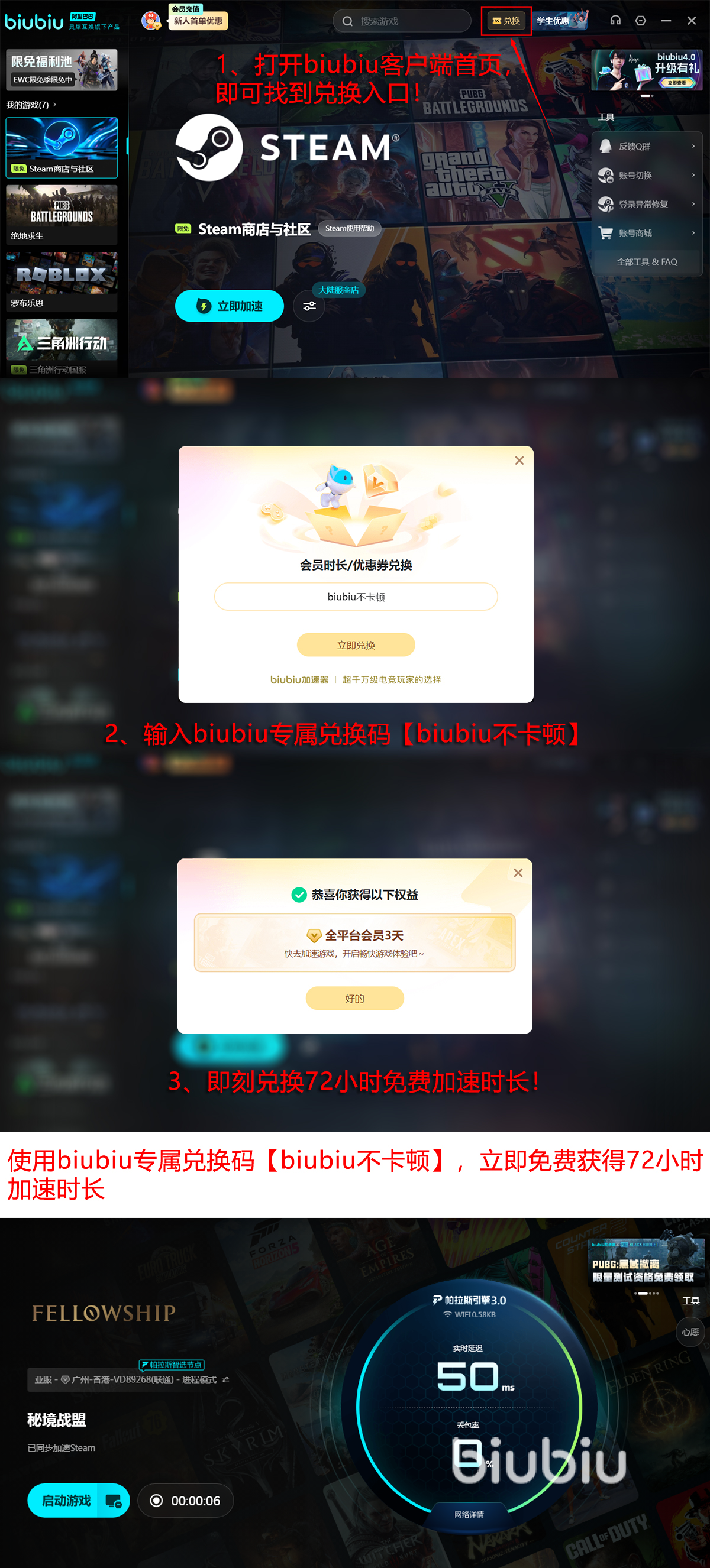 尚未使用过该工具的用户,可立即领取24小时全功能免费试用权限,直观体验网络优化成效。此外,输入专属兑换码【biubiu不卡顿】,新老用户均可额外获赠72小时加速服务。综合计算,首次注册用户最高可享总计96小时连续加速支持,完全覆盖现阶段主流副本周期与日常活跃时长需求。