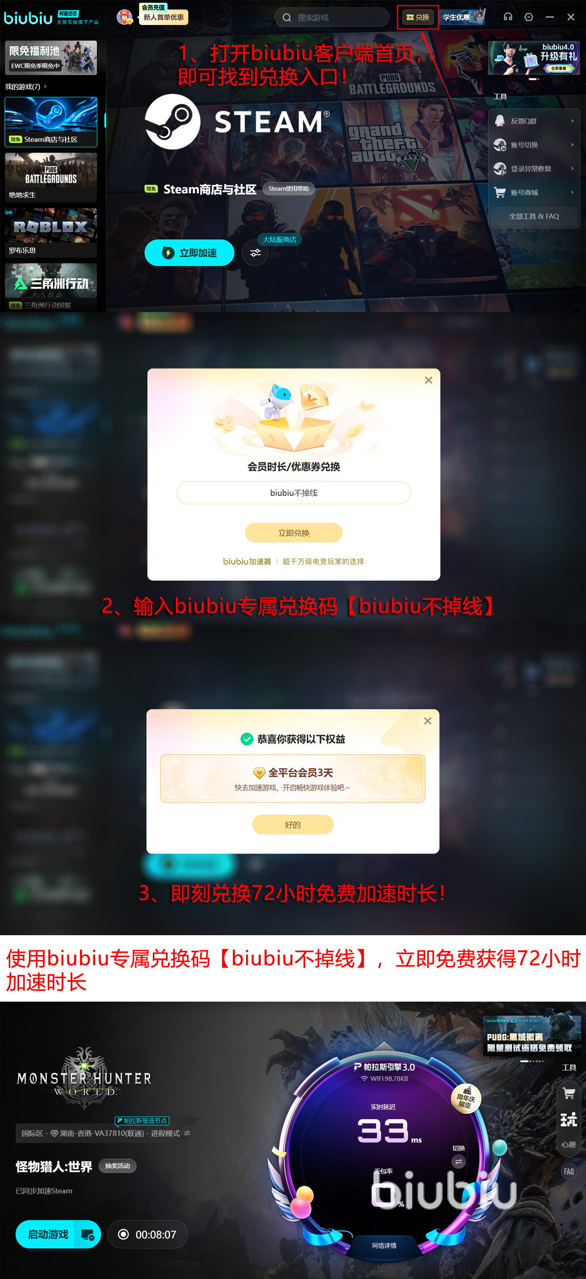 当然各种优惠biubiu也是同期展开的,好用也大方,注册好账号后立马登录,新人享受的免费服务时间为24小时的,首页这里兑换栏再输入【biubiu不掉线】,会得到额外72h时间用,叠加一起之后新人得到的为96小时呢。我们还能享受到对steam平台的限免加速服务,12月18日-1月18日期间,限免游戏池内容大增,可搜索自己购买的steam冬季促销游戏享受服务。