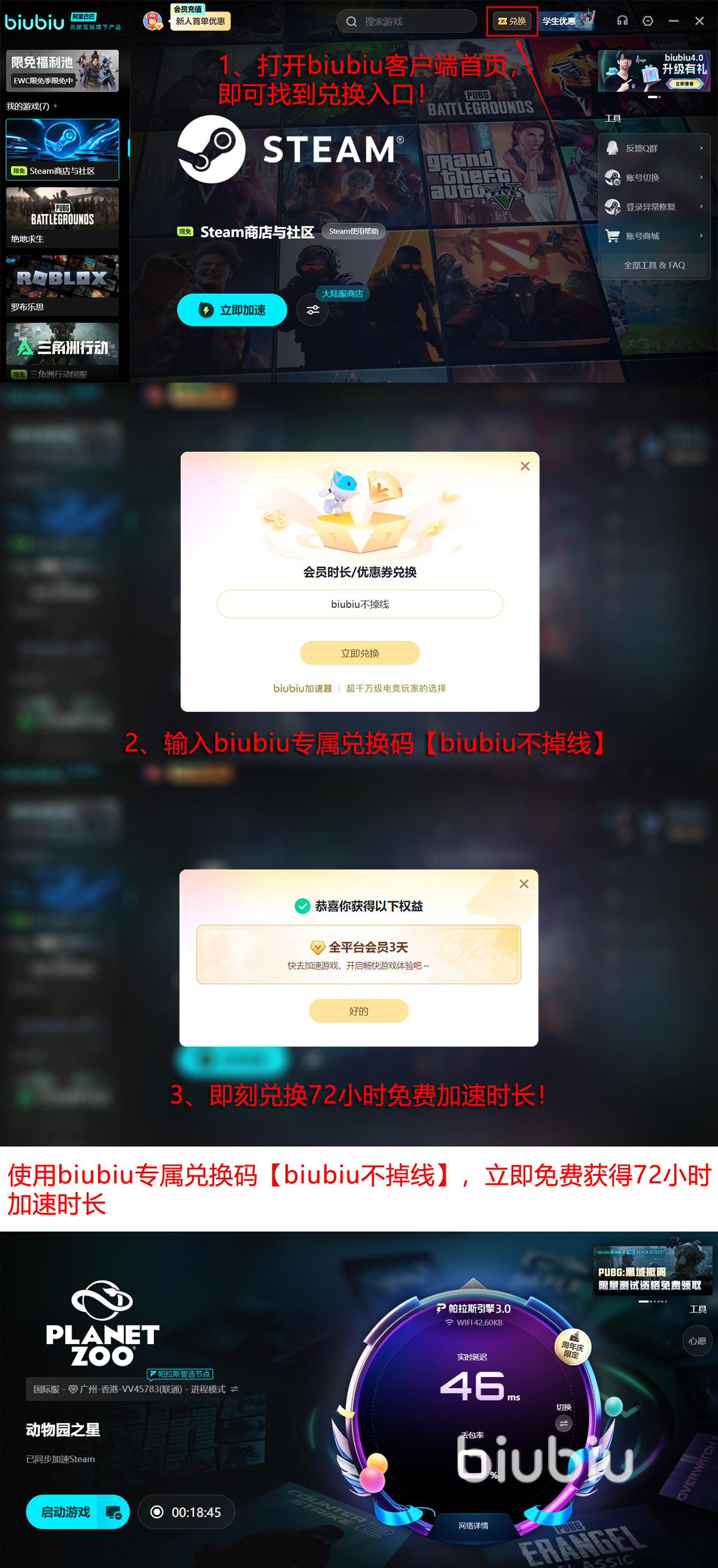steam冬促期间biubiu加速器同步推出一系列专属优惠活动,12月18日-次年1月18日,平台开设限时免费加速专区,用户可领取并使用。首次注册用户群体,权益更为丰富,创建账户后即可获得24小时全功能试用权限,通过【biubiu不掉线】额外享受模拟体验72小时,不掉线模式让玩家更深入感受游戏运行情况,在96小时无间断加速支持下全面参与此次促销季各项精彩内容。