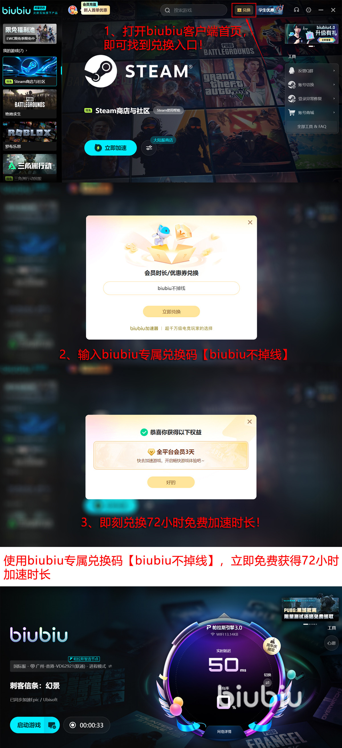 冬季促销期(12月18日-次年1月18日),biubiu加速器设置限时免费加速池活动,可在首页的“限免游戏池”中轻松查找游戏的专属优惠服务,首次注册用户会自动享有基础试用权限24小时的,继而通过【biubiu不掉线】可连续畅快探索72小时,这样将在线加速时长延长至96小时,从而全面满足新手用户的初步需求。