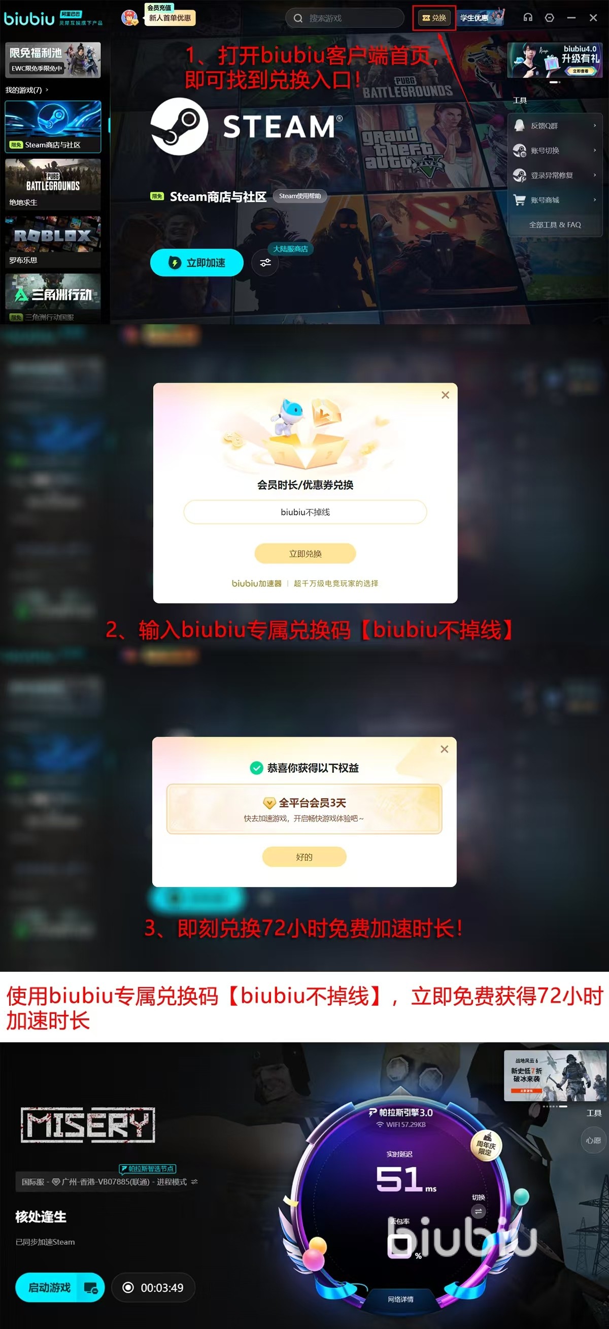 值此biubiu加速器冬季福利活动期间(12月18日 - 次年1月18日),用户可在限免池中自由挑选并获取零成本加速的服务。新注册用户在完成身份认证后可获得全功能试用权限24小时,使用【biubiu不掉线】即可连续体验深度沉浸模式72小时,累计96小时畅游核爆废土世界。