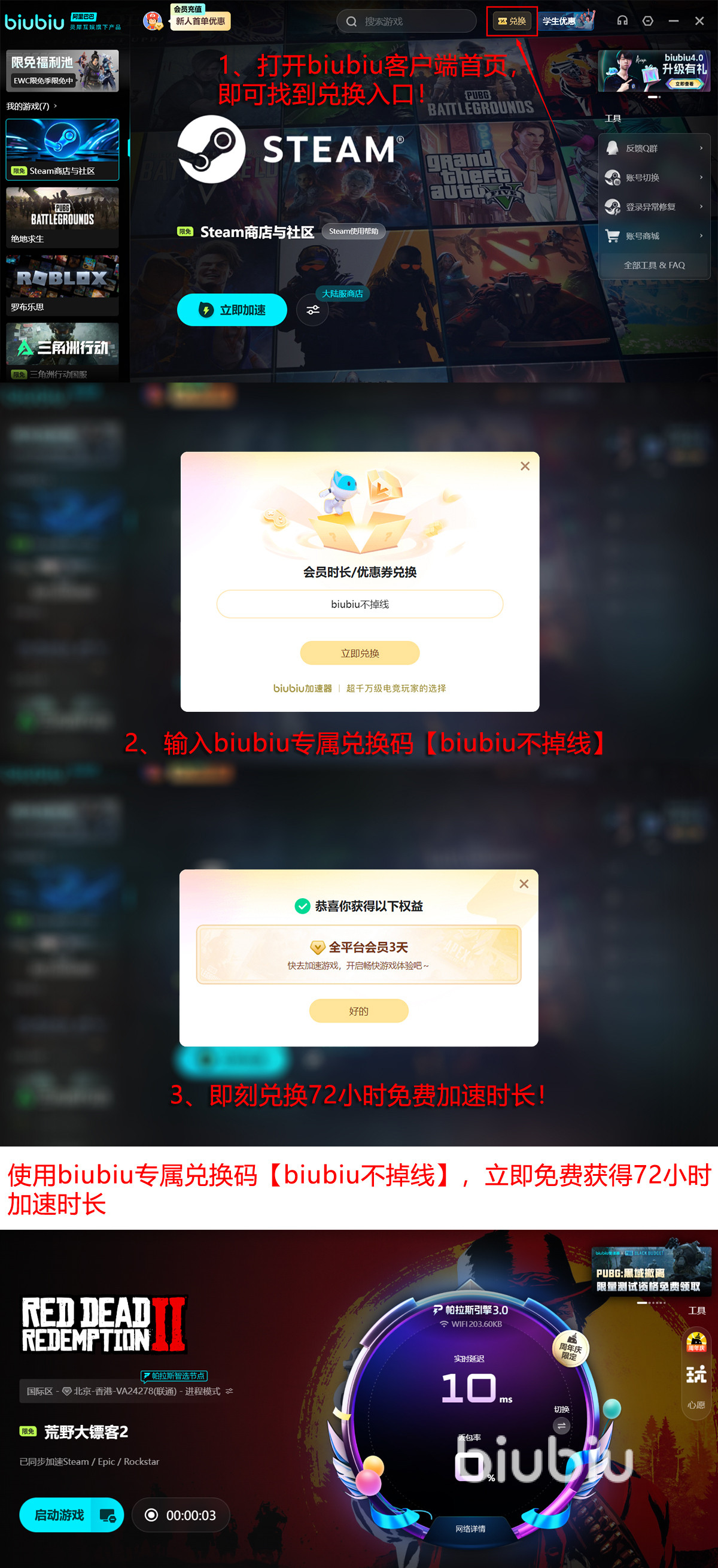 想要用起来没负担,就来白领快乐时光,搞定注册步骤后,新人抓紧领礼包,直接给到的免费24h服务时间,还能领,首页用【biubiu不掉线】再来换,还能多得到72小时用的,叠加领取更爽,新人用的可是96h。biubiu甚至还举办比steam冬促时间还久的优惠期,12月18日开始就能在限免加速池找到好多游戏的提速方式,一直会持续到1月18日结束,偷偷告诉你,steam平台也能享受哦。