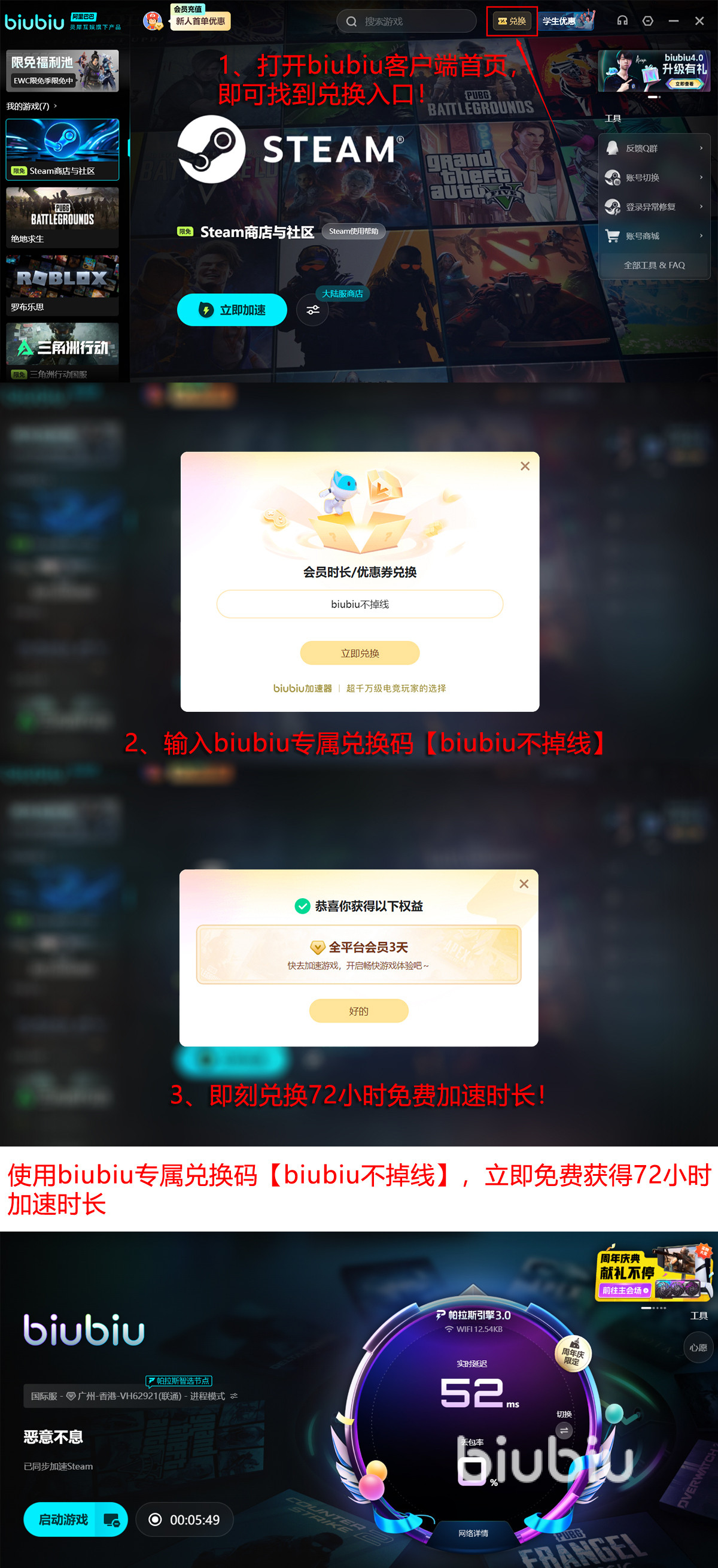 而且,只要用【biubiu不掉线】,就兑换到3天的免费时长,如果是新朋友,首次上线还会直接再送24小时。这样一共就能享受到总共96小时的提速时间。
