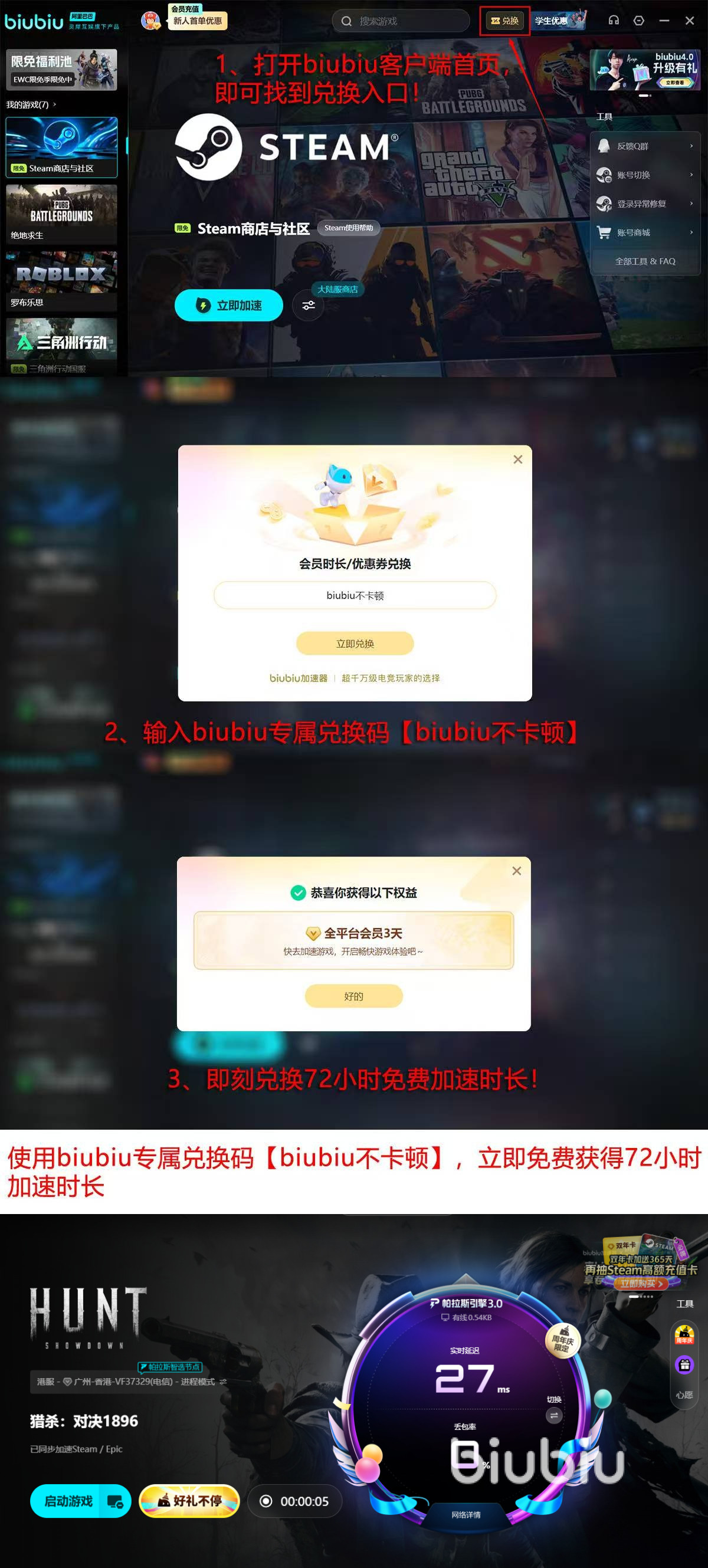 针对冬季促销活动(自12月18日至1月18日),biubiu特地推出了重大优惠举措,期间所有用户都可以参与限时免费加速计划,在指定资源库搜索热门游戏时享受无限制访问权限,新用户注册后会自动获得首日全网通用的免付费提速服务,输入【biubiu不卡顿】还可以解锁额外高速通道使用权72小时,累计可以享有96小时的超值加速权益。