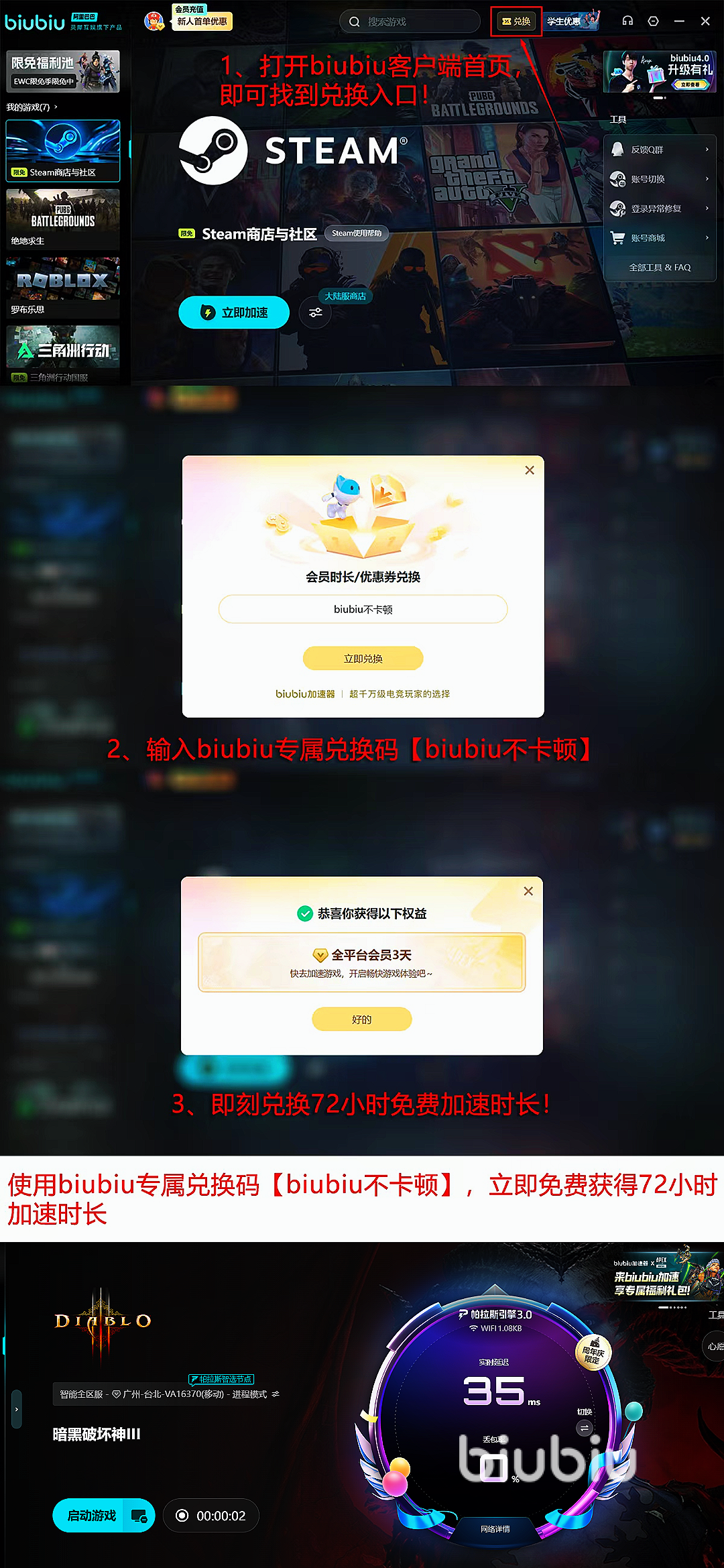 大部分人使用biubiu以后感觉还是挺好的,满意度也高,同时绝大部分的游戏都能加速,并且福利还远不于此,新用户注册biubiu都可以获得24小时免费加速,加速能支持很多的冷门游戏,同时新老用户使用兑换码【biubiu不卡顿】可获3天免费的使用权!