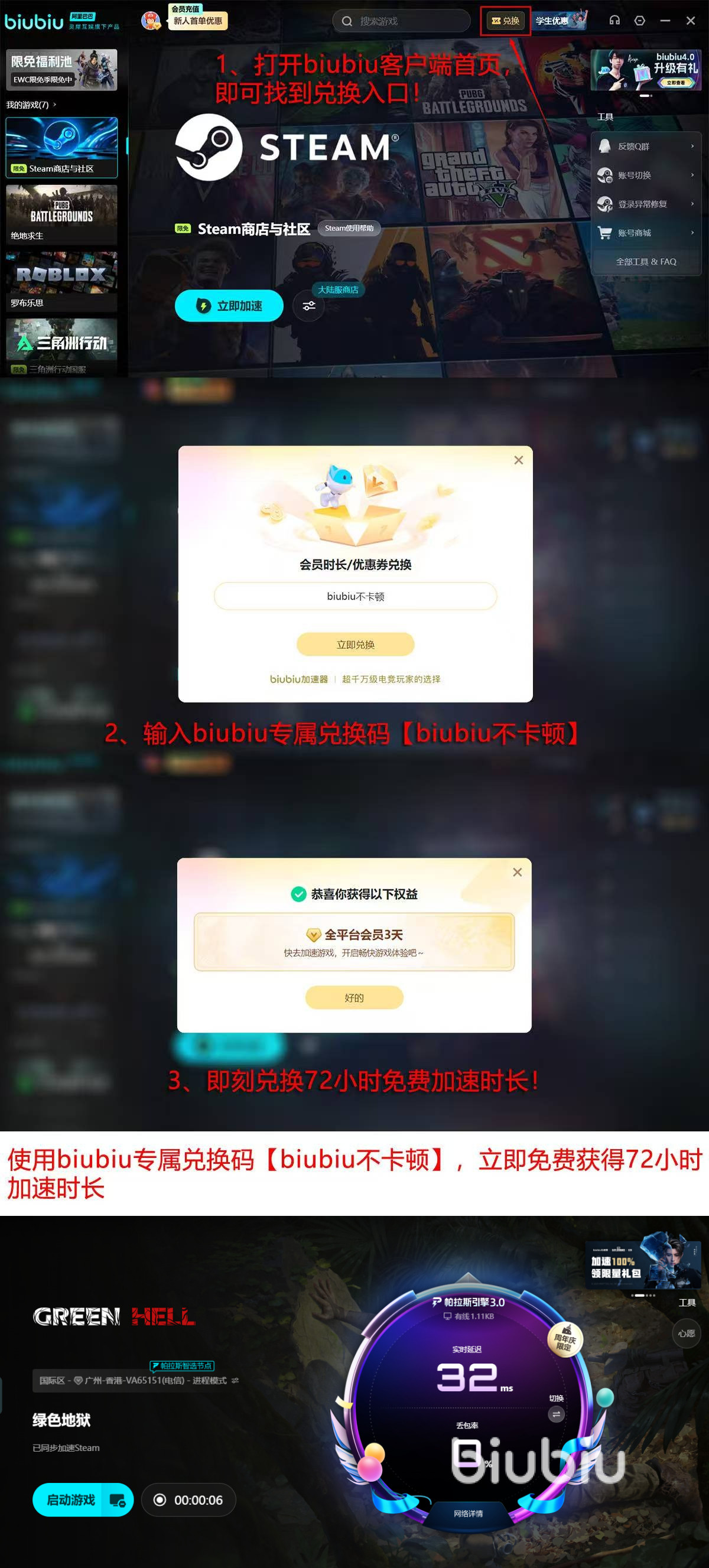 正值steam冬促(12月18日-1月18日),玩家迎来最佳体验时机,biubiu平台开放限免加速池,热门游戏可免费加速。新人注册赠送无门槛专属加速服务24小时,使用【biubiu不卡顿】可继续多轮深度生存挑战72小时,共计96小时免费加速特权。