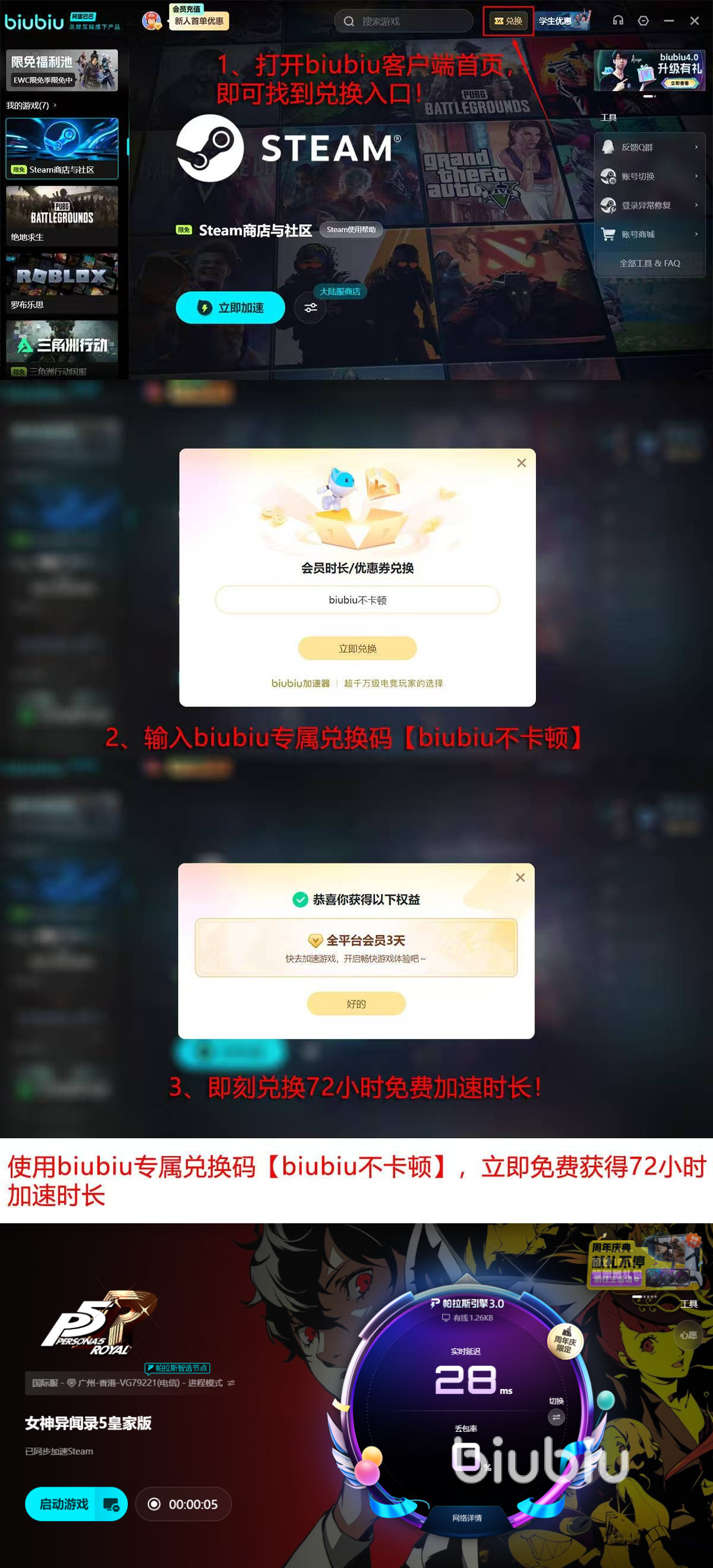 12月18日-1月18日biubiu平台举行冬季限时促销活动限免加速计划,很多热门游戏开放指定资源池内的快速加载权限。对新用户而言,只需在注册步骤结束后马上就能享受24小时通用加速服务,而且通过【biubiu不卡顿】再额外增加无条件制畅玩时长72小时,总共96小时内都可以免费全程加速。