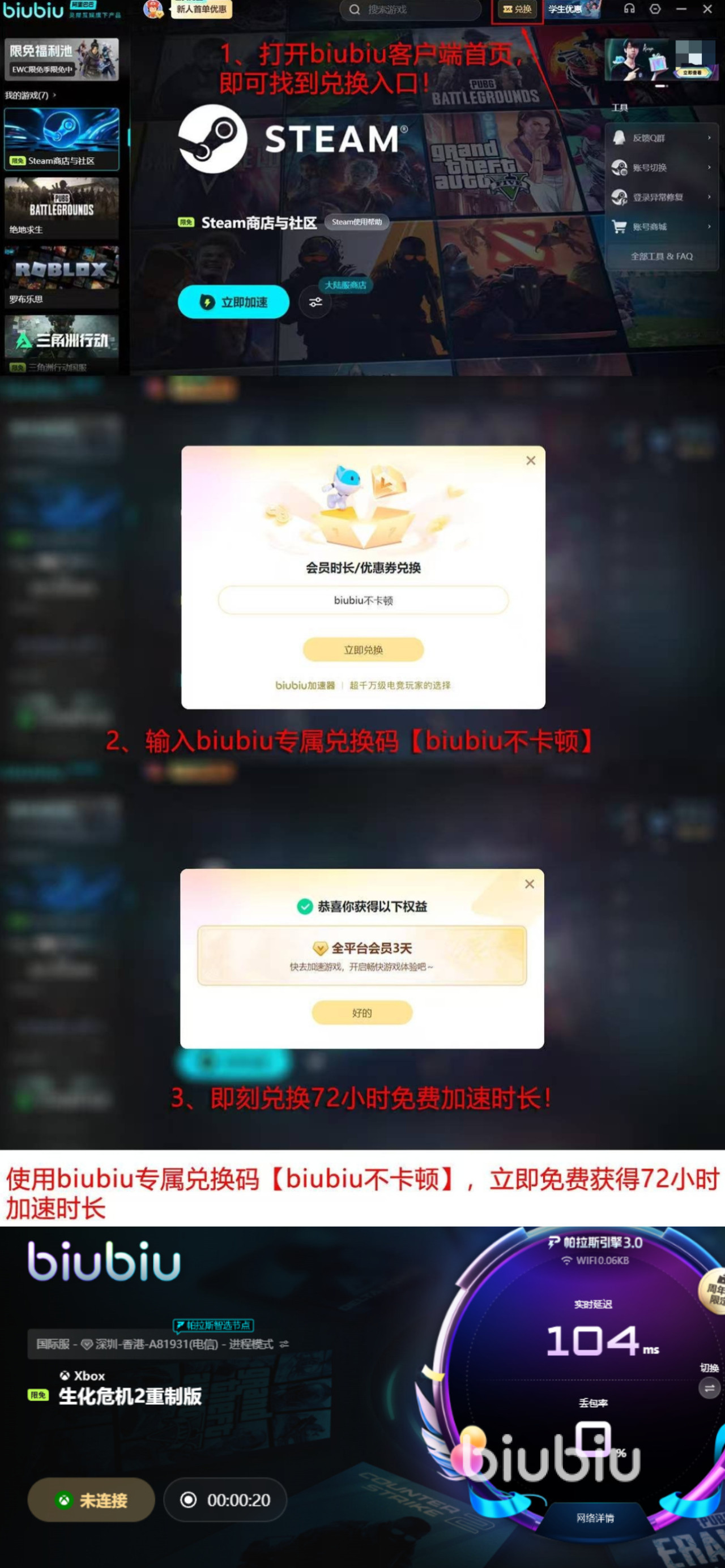 若是大家之前没有用过这个平台,那么更好了,给新用户提供了不少好处,让大家无需充值,比如第一次登陆的小伙伴可以立刻拥有一整天体验时长,由系统自动发放至大家的账户里,无需小伙伴们领取,同时还给所有人提供了三天的体验时间,小伙伴们想要到手,只需通过正确的口令【biubiu不卡顿】拿到手就可以了。