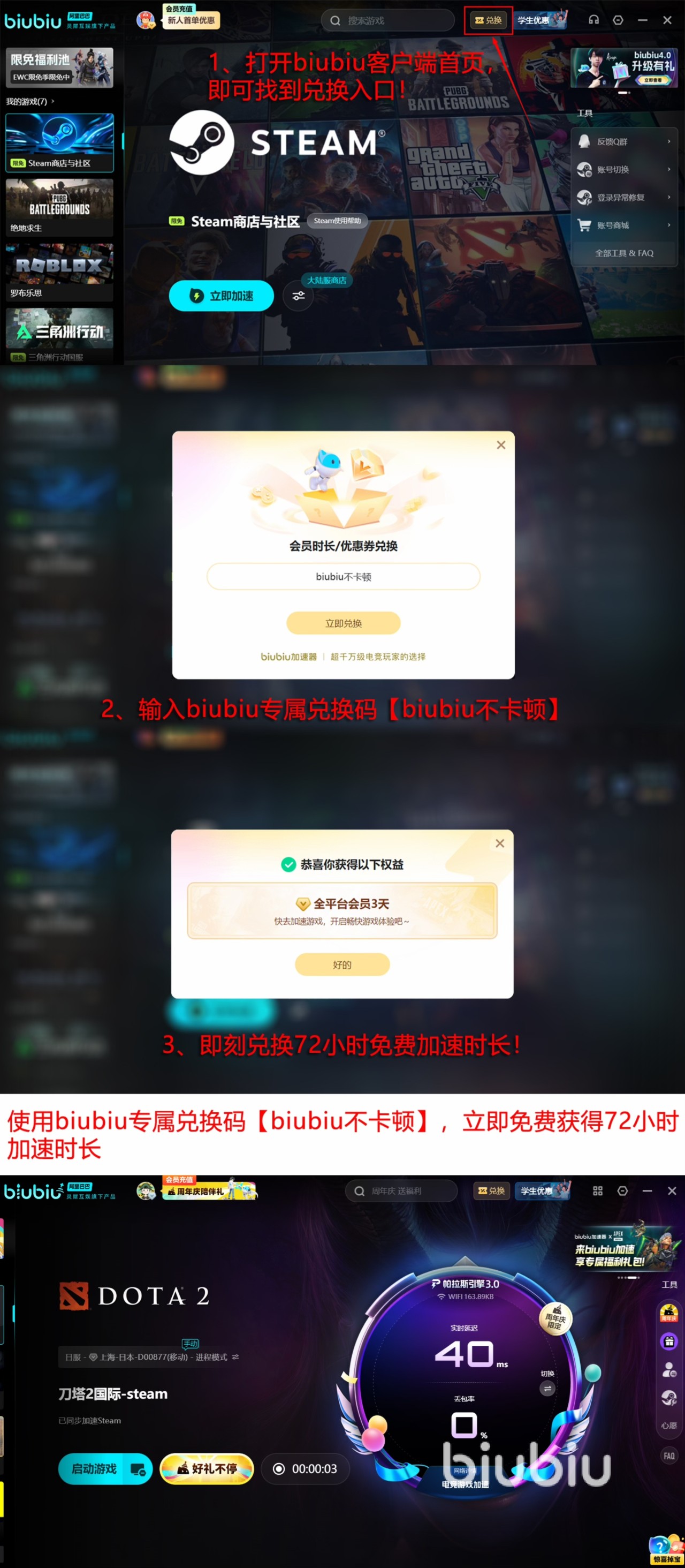 而且最近biubiu还有很让人心动的福利,那就是新人注册后系统会自动赠送24小时的加速时间,不用大家手动去领取了,是不是非常方便省心。如果觉得一天不够体验,输入【biubiu不卡顿】兑换码也可以领取专属的3天加速时间,不管是新老用户都能使用哦。