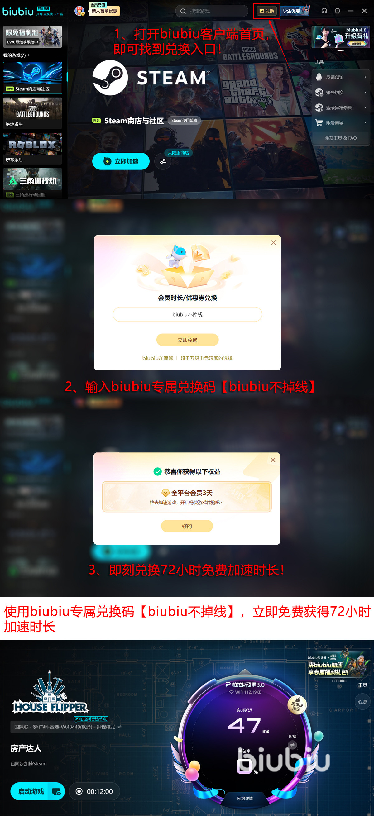 恰逢冬促(12月18日到次年1月18日),biubiu特别推出了专属加速优惠活动,在这一时段,每日均可查看限免游戏池,优先获得限免热游限免一键入库资格,全程享受高速服务。目前新用户首次注册可获得首日全功能试用资格24小时,并可输入指令【biubiu不掉线】即时激活额外超值加速时长72小时,两项福利叠加后总时长可达连续四天,充分满足新手玩家需求。