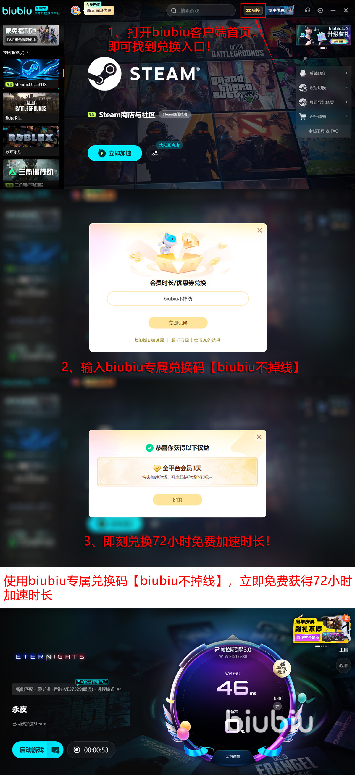 现在还有两项超值福利等你来拿,第一项,是即日起到1月18日大家都能在biubiu的“限免游戏池”中找到更多限免信息并支持一键入库,而且EPIC/steam平台也是可以限免加速的;第二项,使用暗号【biubiu不掉线】去兑换3天时长,而且完成首次注册登录,系统自动加送24小时,累计可享96小时免费服务。
