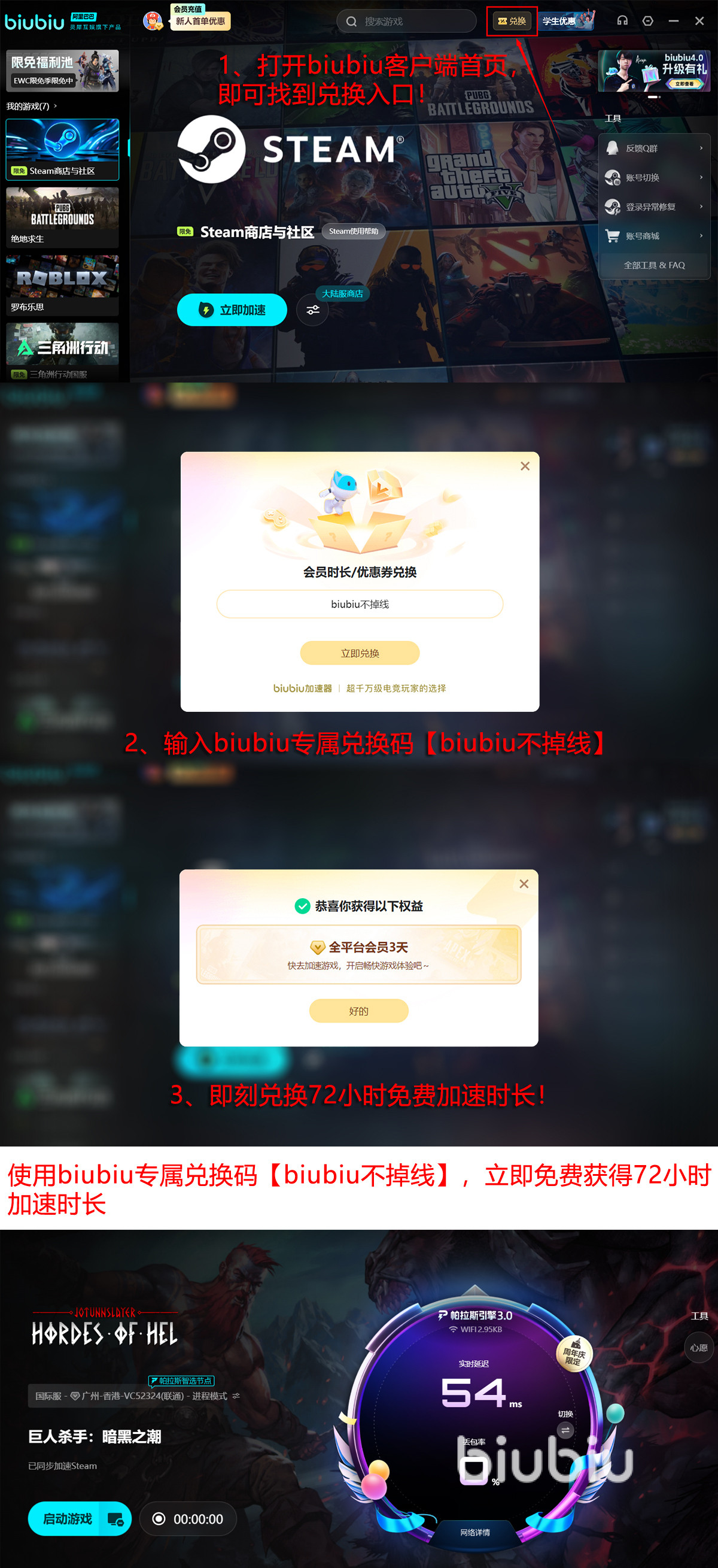 现在注册就能免费领24小时VIP加速,再输入【biubiu不掉线】,还能额外多得72小时。两份福利叠加,你一共能享受长达96小时的超顺滑体验。而且现在冬促期间来biubiu的限免游戏池,可以体验各大平台喜加一游戏一键入库的爽感,活动一直到1月18日,快来试试吧。