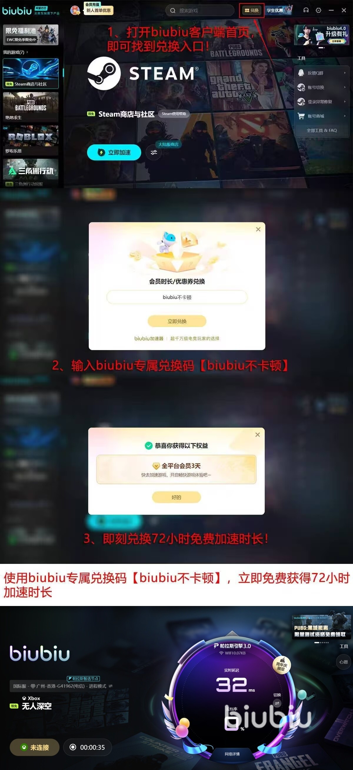 特色的功能优化之外,该加速工具也给大家提供了切实可用的福利支持,即日起只要是第一次注册登录就能拿到无门槛24h全平台免费加速时间。而在兑换界面,正确的便捷小写字母【biubiu不卡顿】足足七十二个小时的会员全平台加速权限,直接到手。让大家更为惊喜的是,在12月18-1月18日这足足的三十天中,在这个冬促的活动中大家可以随意尝试游戏池中的游戏作品,超多的惊喜等着大家来解锁。