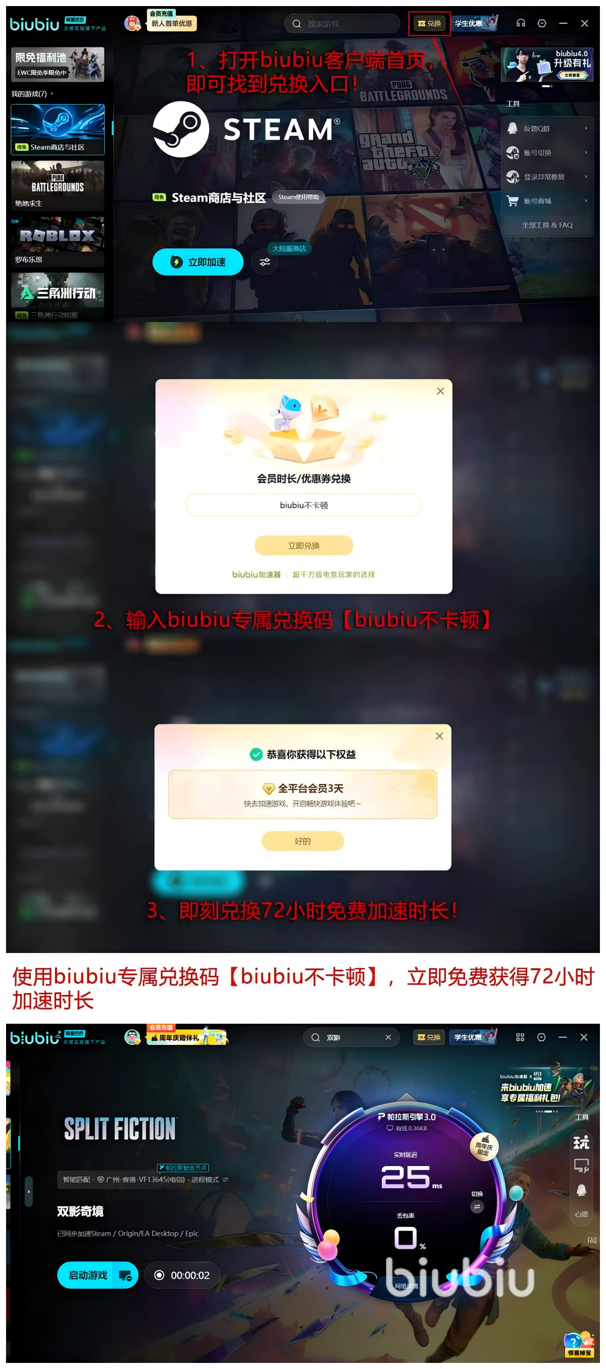 【biubiu不卡顿】按照下图的方法输入其中,直接获取72小时,每个账号领取一次,与新人的24小时福利不重合,总计获取72小时的加速,对于众多羊毛玩家,薅起来异常的顺手,直接体验96个小时的时间,也就是四天内免费会员体验周期,这还不是福利拉满的活动吗。
