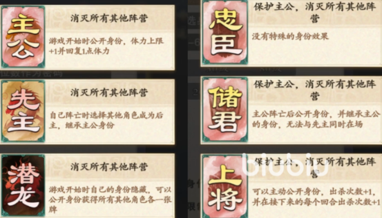 主忠阵营共含8种身份,核心目标为守护主公并清除敌对阵营角色。主公开局身份公开,体力上限提升;明主同样公开身份,每回合可查验一名角色的身份卡;先主阵亡后可指定一名角色转为后主;潜龙在公开身份后,可随机获得其他角色的手牌或装备。忠臣需隐匿身份、全力护主;诸君于主公阵亡后继承其身份及全部能力;上将亮明身份后,每回合可额外执行一次攻击;进军则在主公死亡后接替承受所有伤害,延续主忠阵营存续可能。