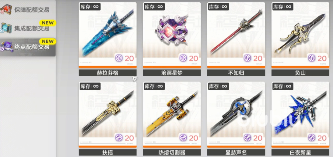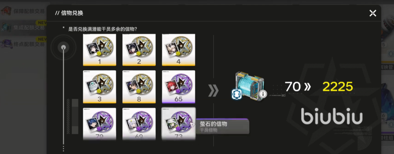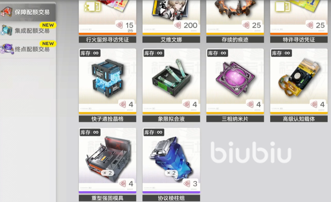 【终点配额交易】专用于武器兑换。玩家可将闲置的六星干员信物按1:10比例折算为专属货币,再换取对应角色的专武。需注意:单个六星信物仅换得10点货币,而一把专武需20点,即等价于2个未使用的六星信物。因此仅推荐为主力输出干员(主C)兑换专属武器,确保资源投入产出比最大化。