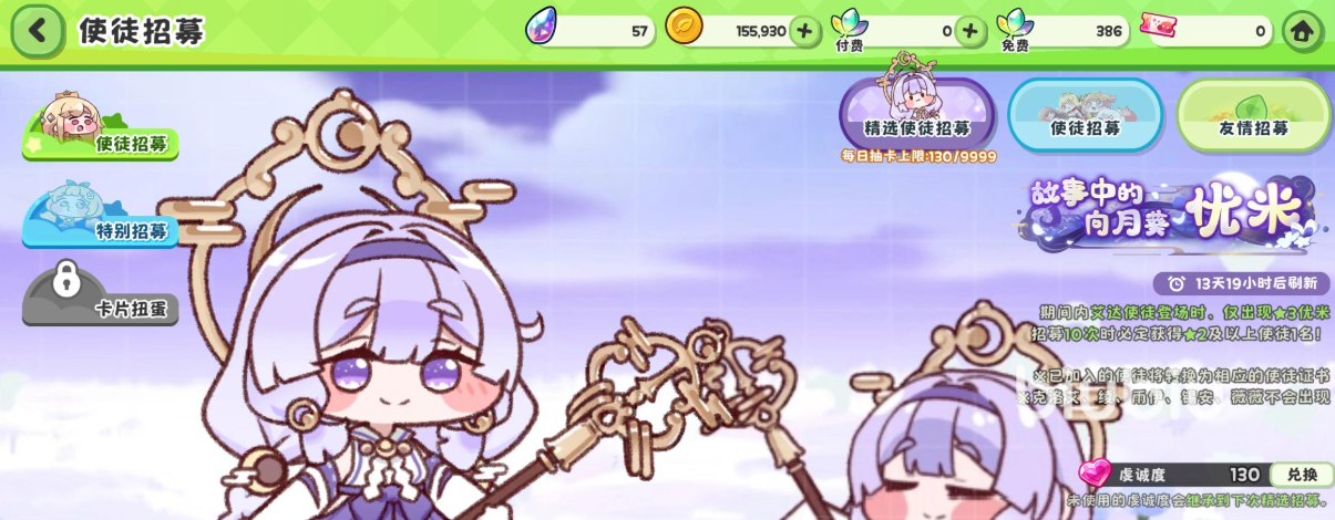 获取方式上,优米仅可通过游戏内“使徒招募”系统抽取,且仅限于限时UP卡池——即“精选使徒招募”。首次抽取必得三星优米,后续升星依赖重复获取角色碎片。卡池不设保底机制,但设有累计抽取进度系统:单角色满命需累计300次抽取,初始阶段即需投入300抽方可达成完整培养条件,后续提升则依赖持续积累与概率触发。