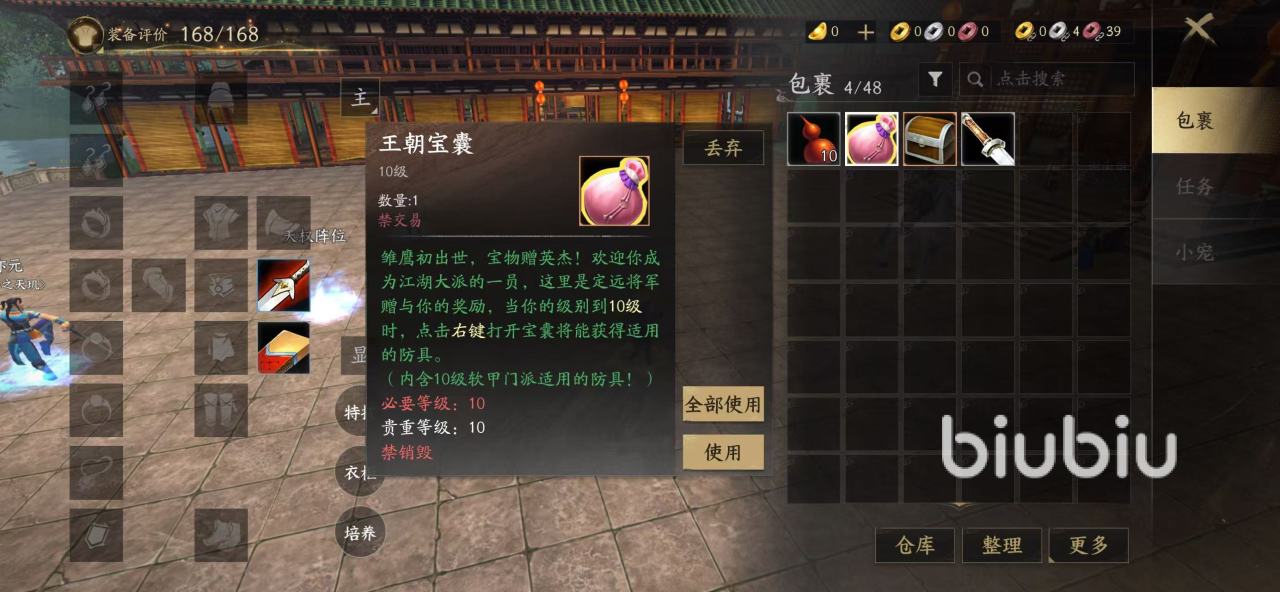 玩家完成初始角色创建并进入江湖世界后,可通过推进主线任务逐步积累经验与资源。在任务进程中,系统将自动发放王朝包囊至角色背包。该道具默认存放在背包栏位中,只需点击屏幕右上角的包裹图标即可查看和管理。