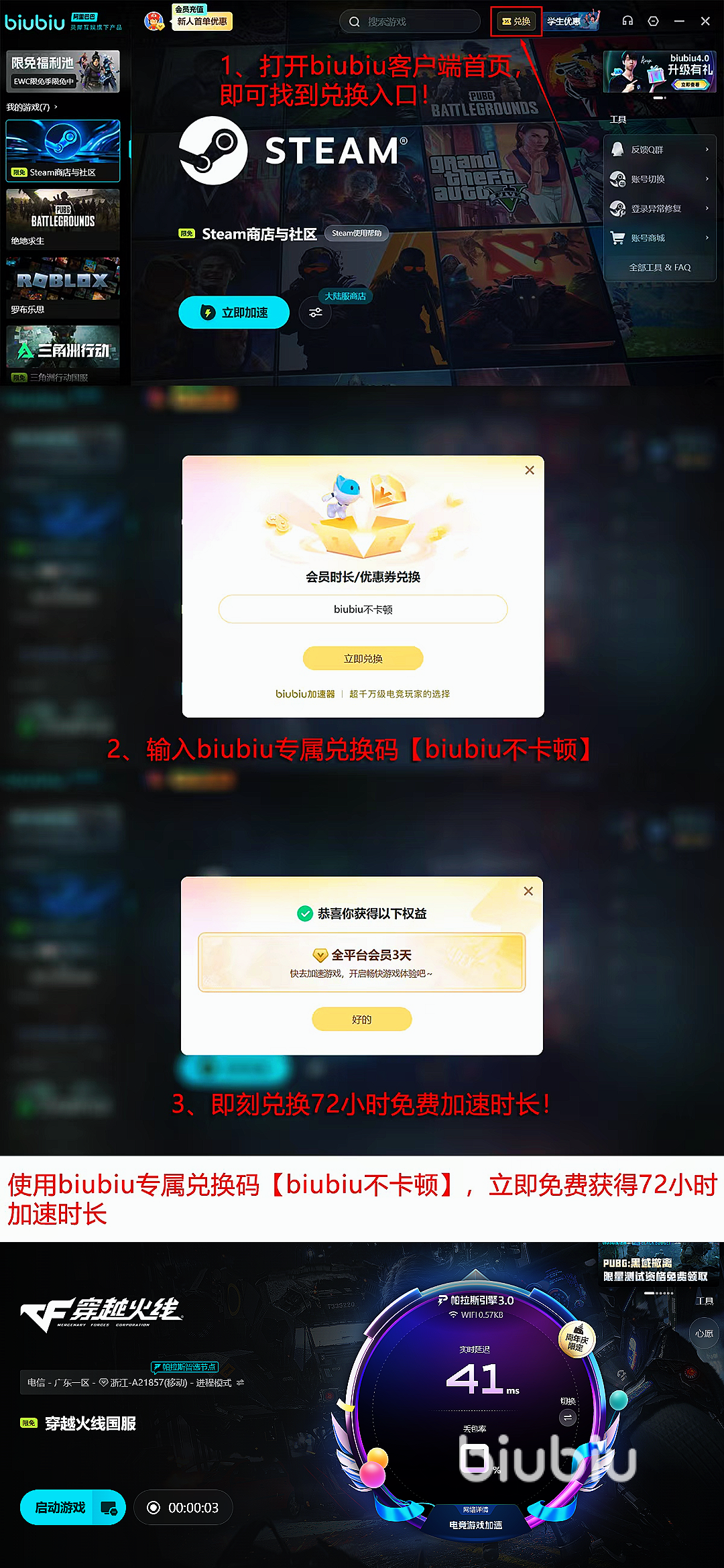 类似cf这样的fps射击游戏,基本上都是需要使用加速器进行加速,因为会出现各种各样的网络问题导致闪退,而biubiu这方面还是值得信任的,对于新用户也友好,新用户注册biubiu都可以获得24小时免费加速,而且新老用户使用兑换码【biubiu不卡顿】可获3天免费的使用权!