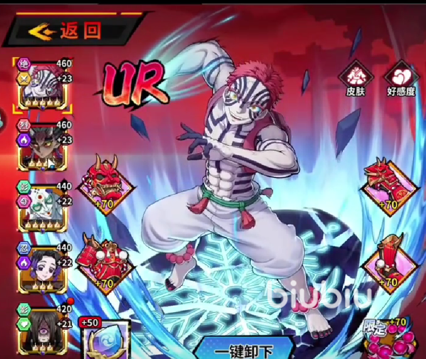 堕姬定位为多维干扰型辅助,核心机制围绕“魅惑”与“毒蚀”。其一技能“妖艳之舞”有45%概率使目标陷入“魅惑”(下回合随机攻击友军),三技能“毒雾弥漫”则为敌方全体施加两回合“腐蚀”状态,每回合削减目标10%防御力并降低治疗效果30%。该组合使其成为破防体系中的关键支点,尤其适配高爆发但依赖穿抗的物理队。