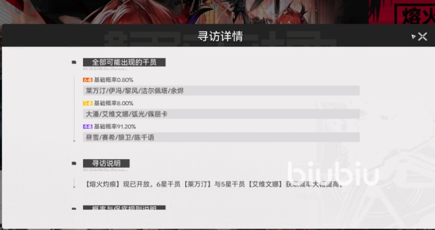 每次寻访成功后,系统将依据所获干员星级发放对应数量的“灼痕结晶”,该道具专用于“武器熔铸”系统,用于锻造适配干员特性的专属武器装备。此外,卡池内还稳定产出大量前期紧缺资源,包括干员升级所需的经验材料、技能专精所需的强化素材等,有效缓解新手期养成资源短缺问题。卡池核心六星干员为火属性近战输出,其机制以“灼烧层数叠加”为核心:普攻自动施加灼烧效果,叠满层数后可触发大范围群体爆发伤害,具备持续压制与清场双重能力。