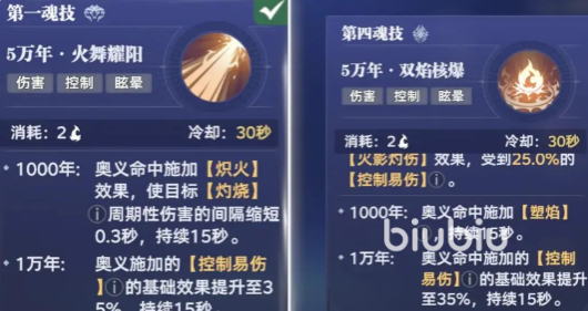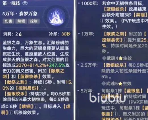 奥义技【森罗万象】具备大范围群体压制能力,基础伤害为2070+点,附加814.2%与247.5%两段奥义加成。技能命中后同步触发【蓝银绞杀】与【献祭之刺】双重效果:前者每0.5秒削减目标5%最大韧性条,并附带0.6秒禁锢;后者初始提供15%控制易伤,升至黄四星后提升至25%,持续时间由15秒延长至20秒。配合被动【蓝银皇献祭】,单次禁锢可延长至1.5秒,显著强化控场稳定性。