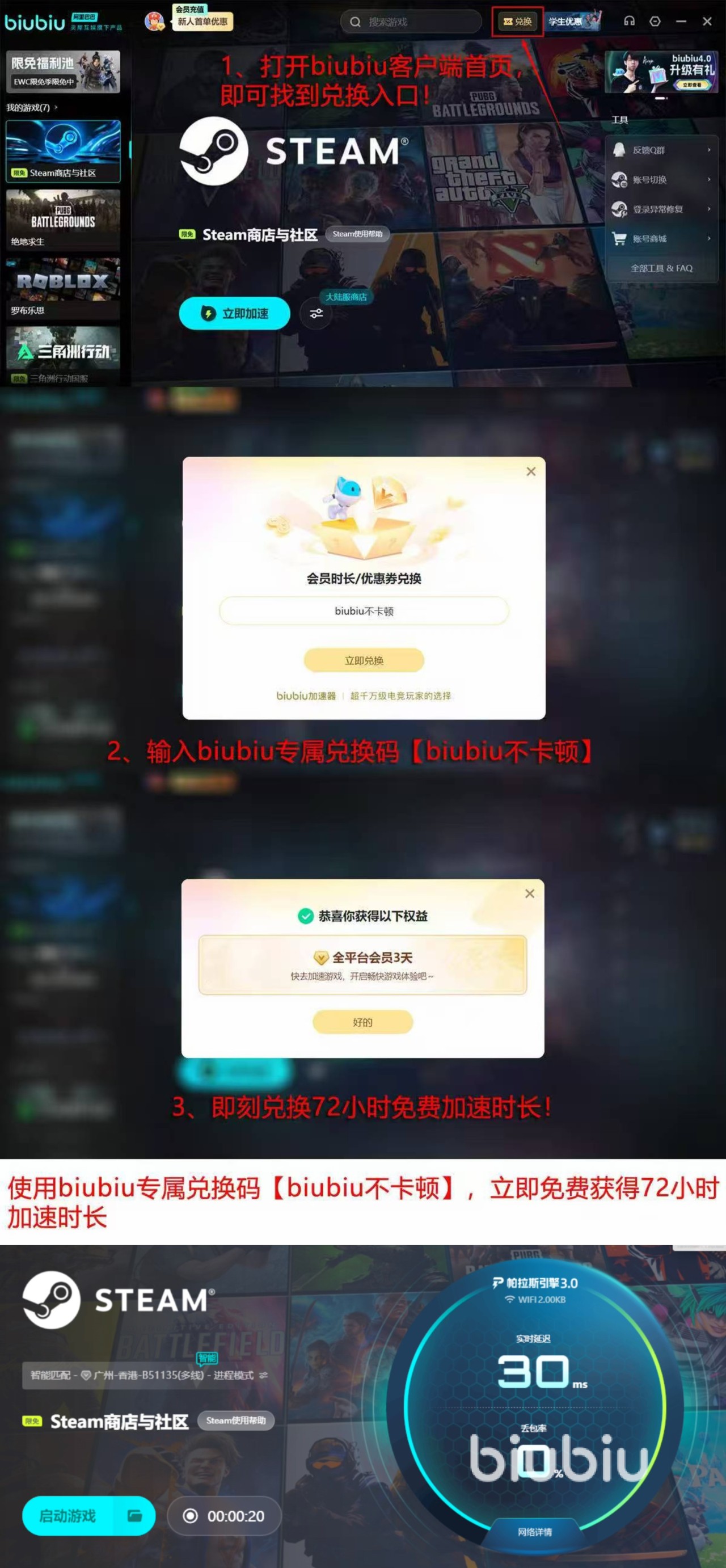 面向新用户,平台推出零门槛试用机制,切实降低决策成本。完成首次注册后,即可免费获取24小时全功能加速权限,覆盖主流MMORPG、FPS及MOBA类游戏;后续输入专属兑换码【biubiu不卡顿】,还可额外激活72小时加速服务。合计四天无限制体验期,足够完成多款游戏的全流程测试,包括登录、匹配、对战及结算等典型网络交互环节。平台坚持“先体验、再选择”原则,不设强制付费门槛,助力新手快速建立使用信心。