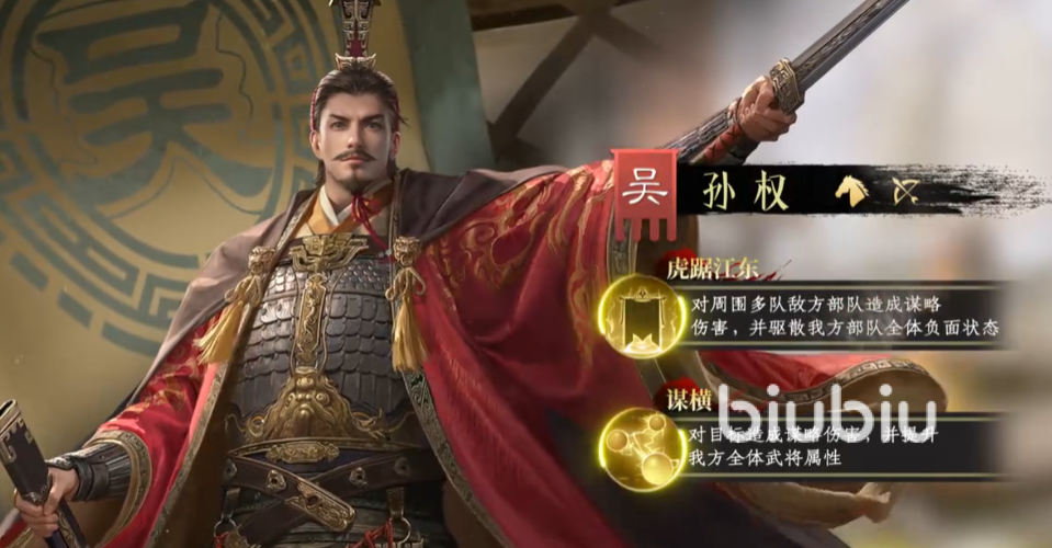 孙权作为主角级武将,兼具输出与团队赋能双重定位。其主动技能可对敌方单体施加谋略伤害,并在命中后为全体友军同步提升智力、统率、武力三项基础属性,形成多维增益。进入中后期,其战技“江东”不仅覆盖大范围高额伤害,还能清除我方单位所受负面状态,是攻防一体的关键枢纽。