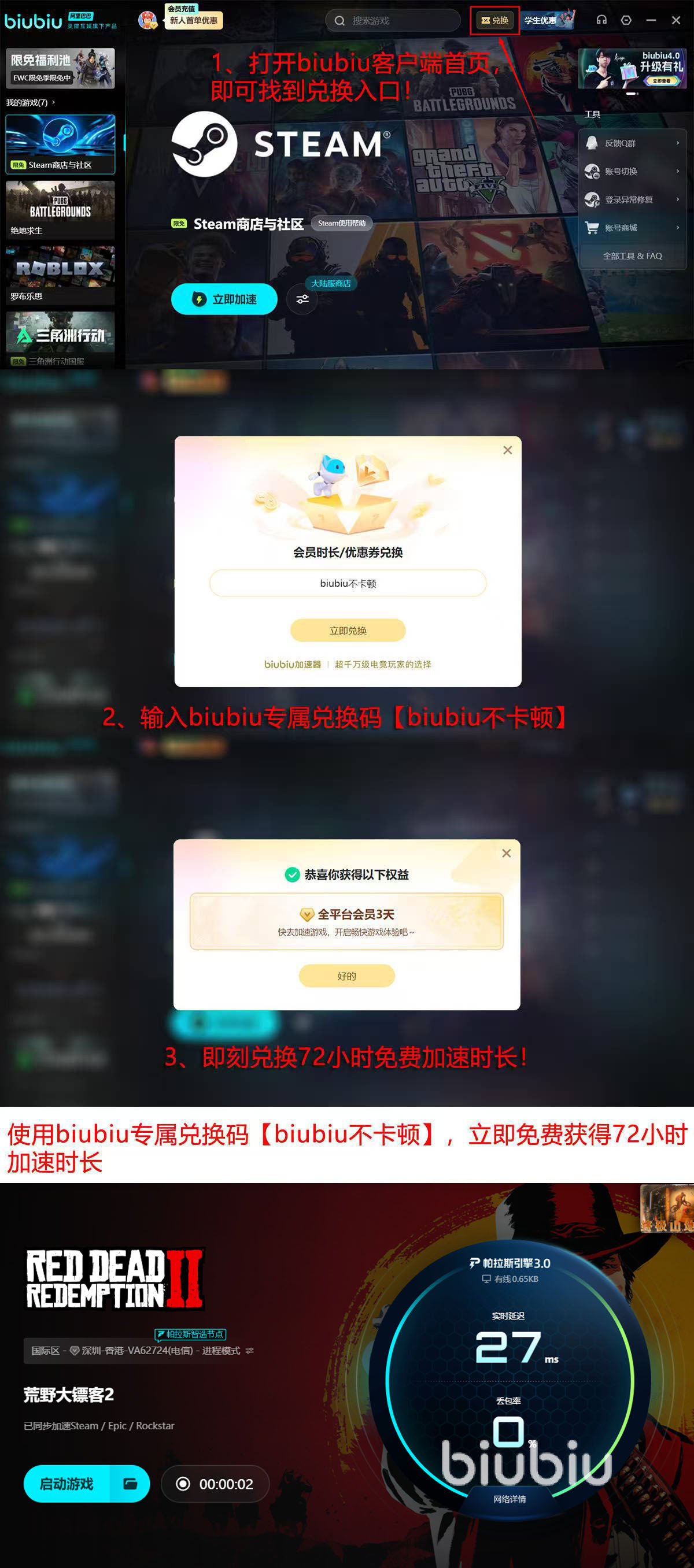 考虑到《荒野大镖客:救赎2》高度依赖低延迟网络环境以支撑其动态事件系统与多人协同机制,部署专业加速工具具有明确必要性。目前biubiu加速器提供便捷入门体验:安装过程仅需三分钟;新用户注册即赠24小时免费试用;登录客户端后点击“兑换”入口,输入口令【biubiu不卡顿】,还可额外领取72小时加速时长——总计可享96小时无门槛使用权益。