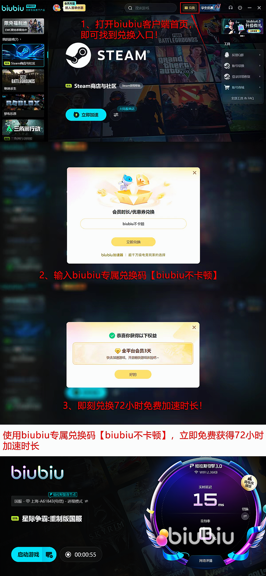 biubiu加速器支持全平台部署,用户反馈整体体验良好。新注册用户可直接获得24小时全功能免费试用权限;所有用户输入兑换码【biubiu不卡顿】,即可额外领取3天高级服务使用权。