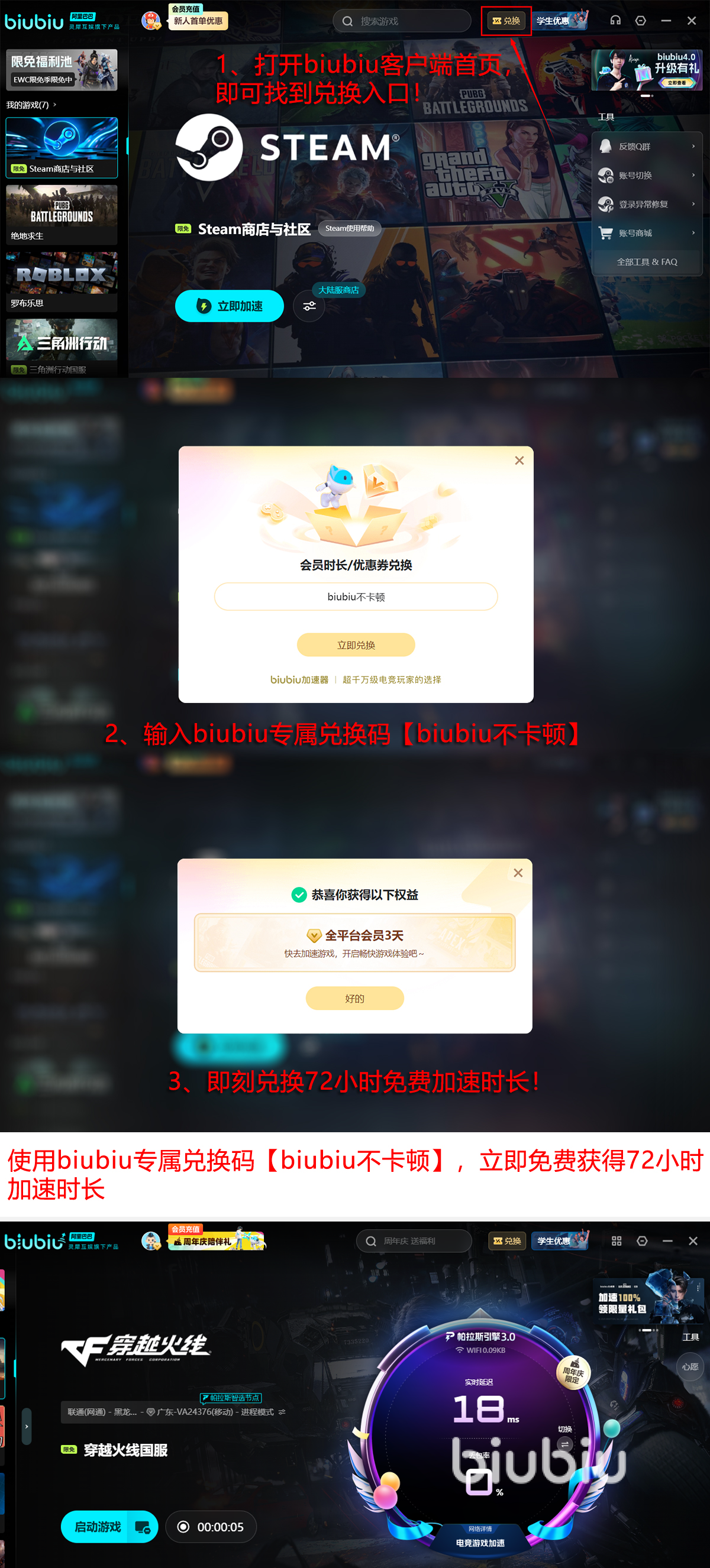 当然没用过的人还是想先试一下,新人可领取24H的免费加速,用了后就发现所有问题都没了。若是还打算多玩一段时间的话,那么新老用户可输入兑换码【biubiu不卡顿】,即可额外领取三天免费加速;总的来说,新人就算是能获取96H的免费加速了!