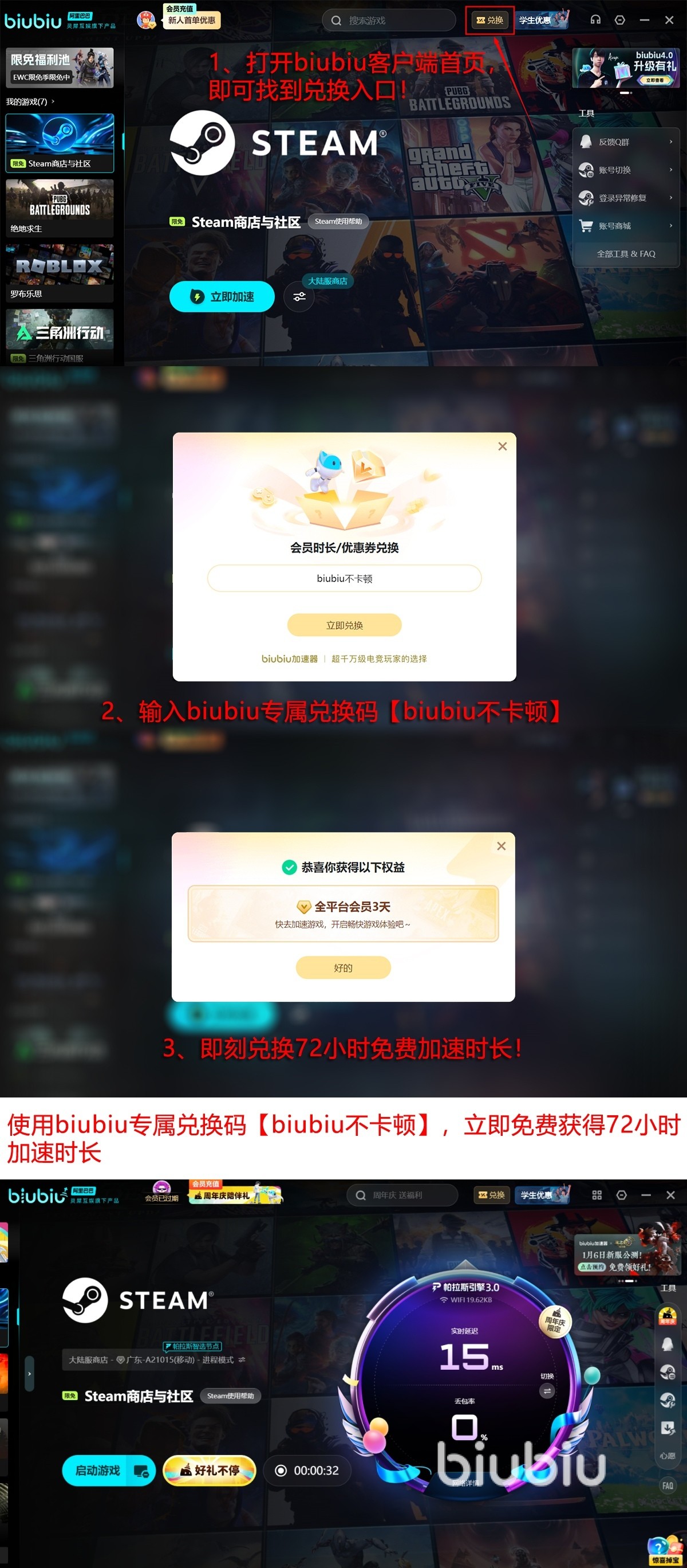 如果还在担心biubiu在性能方面无法达到自己的要求,现在直接注册一个新biubiu号,利用现在新号免费加速24小时的福利亲身感受一下。这样不用先付费,当然也不会有任何损失了。最后给大家提供一个兑换码【biubiu不卡顿】,这是每个号都可以用一次的通用福利,能够免费获得三天加速时间,这些福利一定要充分利用起来。