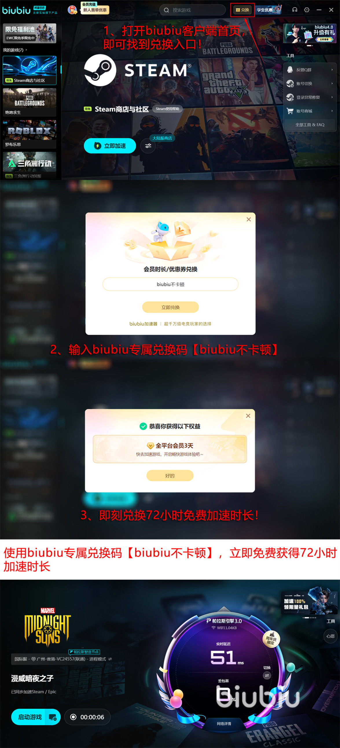 当大家打开biubiu搜索到游戏后,就可以直接点击进行加速。加速引擎会自动选择合适的线路进行连接,在连接上之后也会不断监测网络,一旦出现波动或者是某个节点拥堵能实现自动切换。这样就从各个方面一起着手,解决闪退卡顿的问题。如果想要体验一下biubiu的真实效果,就抓紧注册一个新号,新号有24小时免费加速的福利。这是一项长期活动,欢迎新用户加入。还需要记住一个兑换码【biubiu不卡顿】,能兑换72小时的加速时间,每个号都能兑换一次,这样就不用担心实际性能不符合自己的预期了。