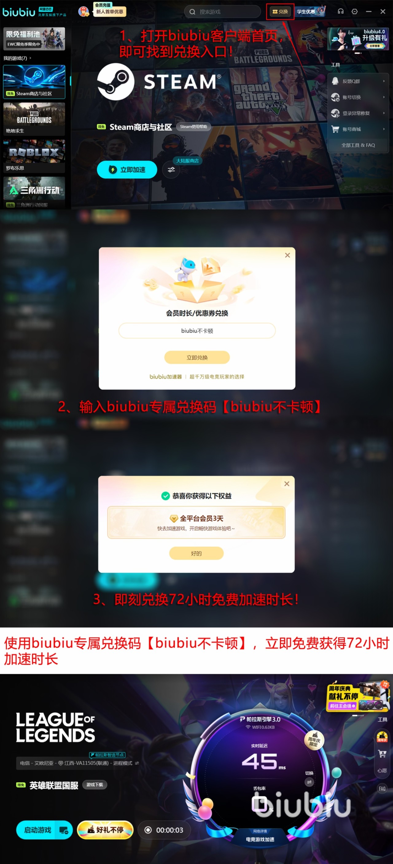 这次的有效升级为biubiu吸引来了一大批新用户,所以它也推出了给大家的两个福利,首先是新用户可以通过注册领取24小时加速时长,其次是新朋友老朋友都能用【biubiu不卡顿】兑换码拿到3天加速时间。