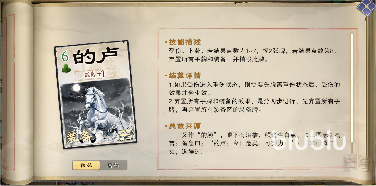 的卢作为高防御代表,不仅基础护甲值突出,更搭载独特“卜卦”被动:受击后触发随机点数判定(1–7点),成功则为己方武将补充两张手牌;若判定为8点,则触发负面效果——清空当前所有手牌与装备,且的卢卡牌本身亦被销毁。该机制赋予其双刃剑特性,需配合控场手段或高容错卡组谨慎使用。